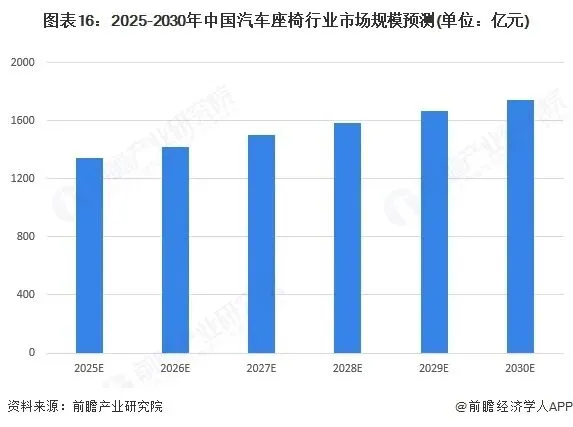 中国汽车座椅行业发展呈现技术创新与市场竞争多元趋势。技术上,向智能化、轻量化、环保化、个性化演进;市场竞争方面,原有海外巨头占优格局改变,内资企业借新能源与智能座椅技术加速国产替代,自主座椅企业凭成本、服务优势,有望在市场格局变化中获更多份额,竞争主体更趋多元。中国汽车座椅行业需求增长前景广阔。在新车市场,汽车产销量的持续上扬为其注入发展动能,经济发展与生活水平提升,让汽车愈发成为大众出行刚需,像国内自主品牌崛起,新能源汽车销量猛增,都直接拉动座椅需求。后市场同样不容小觑,汽车保有量的逐年累加,使得座椅的维修、更换、升级需求持续释放,尤其在车龄增长,座椅出现磨损老化后,消费者更换意愿强烈。消费观念升级下,消费者对座椅的舒适性、安全性、个性化与智能化要求渐高,从追求基本的坐感舒适,到渴望具备加热、通风、按摩、智能调节等功能的座椅,这驱使车企不断升级座椅配置,进而创造新需求。此外新能源汽车发展浪潮中,其独特的车内空间布局与智能化属性,促使适配的专属座椅需求攀升,零重力座椅等创新产品逐渐普及,为行业开拓全新需求领域。整体来看,未来中国汽车座椅行业市场规模仍呈现增长趋势发展,初步估计2030年中国汽车座椅行业市场规模约达1746亿元,年均复合增长率为5.4%。更多本行业研究分析详见前瞻产业研究院《全球及中国汽车座椅行业发展前景展望与投资战略规划分析报告》