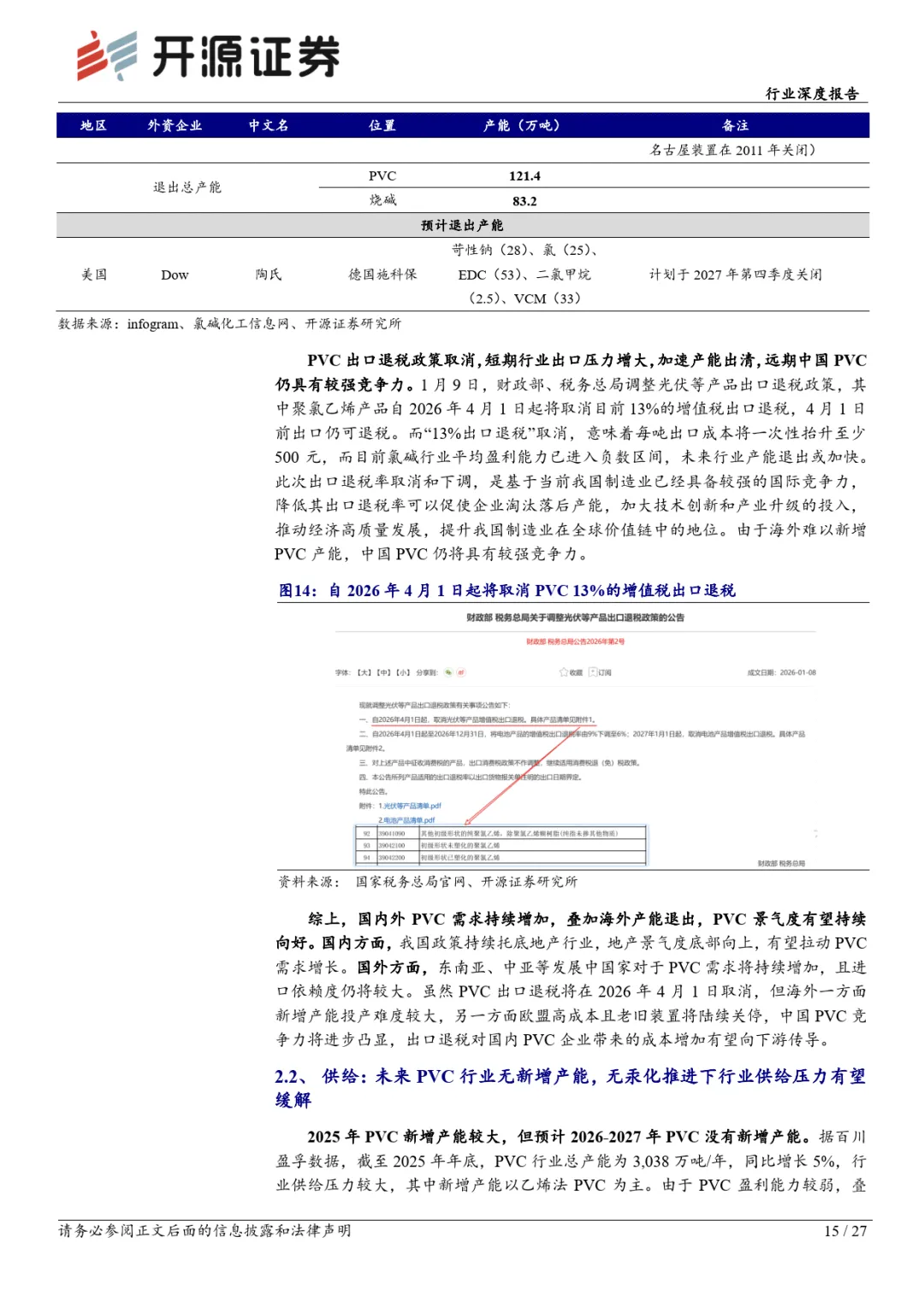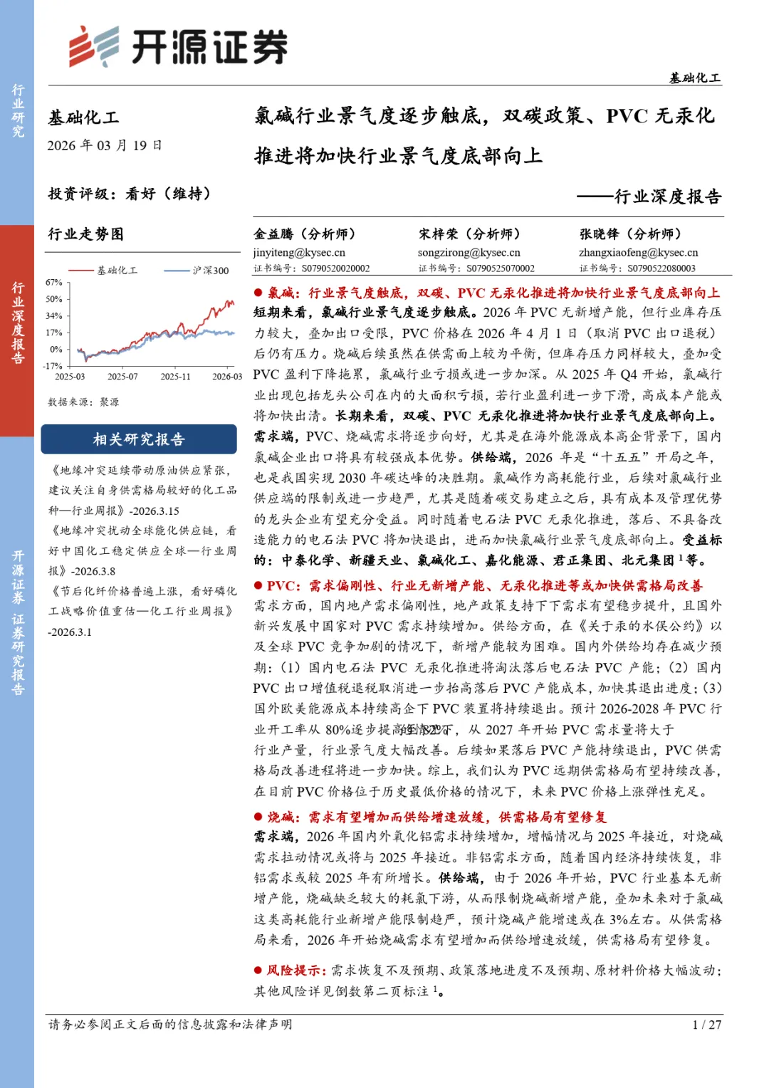开源证券 2026 年 3 月 19 日发布氯碱行业深度报告,核心判断为行业景气度已逐步触底,双碳政策与 PVC 无汞化将推动景气快速向上,给予行业 “看好” 评级。