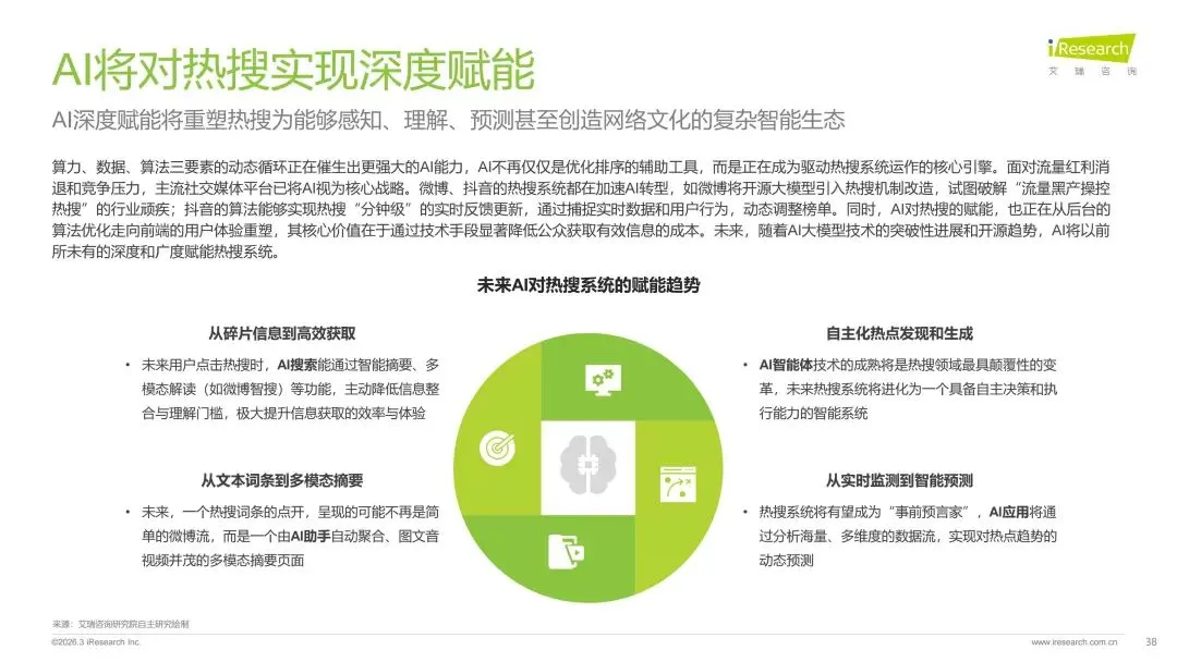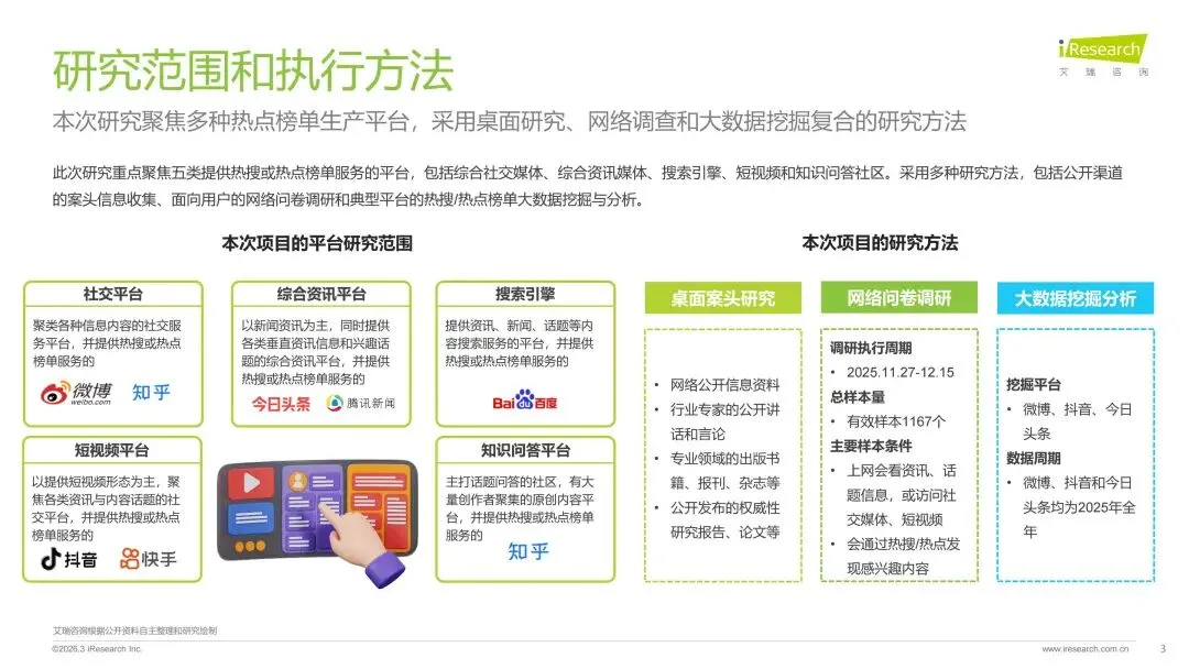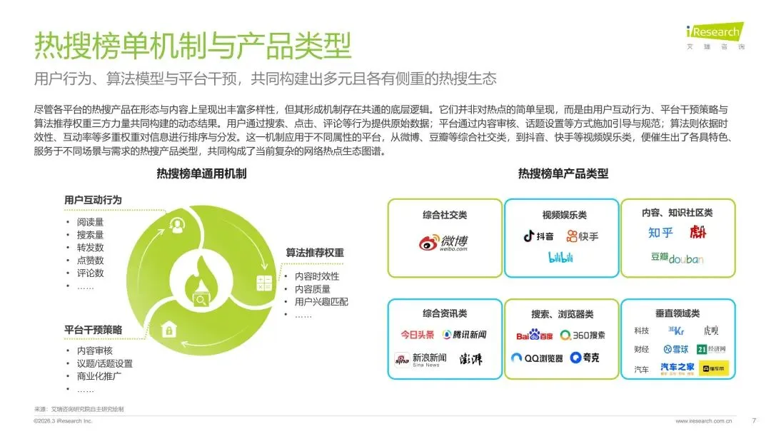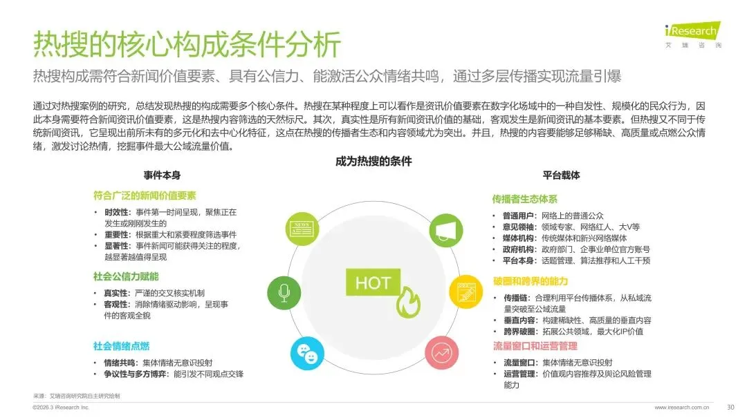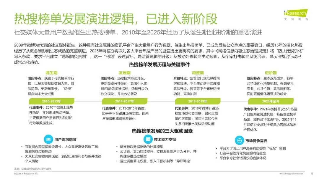 本报告旨在系统剖析数字时代热搜榜单的演进脉络、社会作用与未来趋势走向。报告梳理了网络媒体热搜榜单从萌芽诞生到进阶的发展历程,揭示了其如何逐步成为公众感知热点、参与讨论的核心信息枢纽。在此基础上,报告深入分析了用户对即时、聚合热点内容的深层需求,并以此为基准,评估了当前主流平台热搜产品的形态、设计逻辑和热搜数据表现。通过对时政、社会、公众人物事件、垂直破圈事件、文娱等多元领域的典型案例进行解构,报告详细阐释了热搜事件的典型构成条件、传播路径及其所产生的广泛社会影响力。