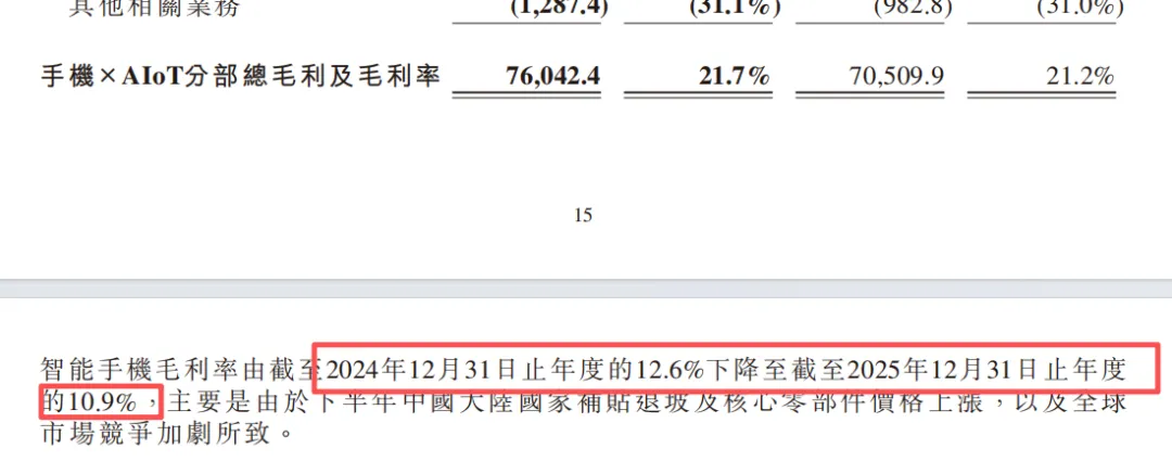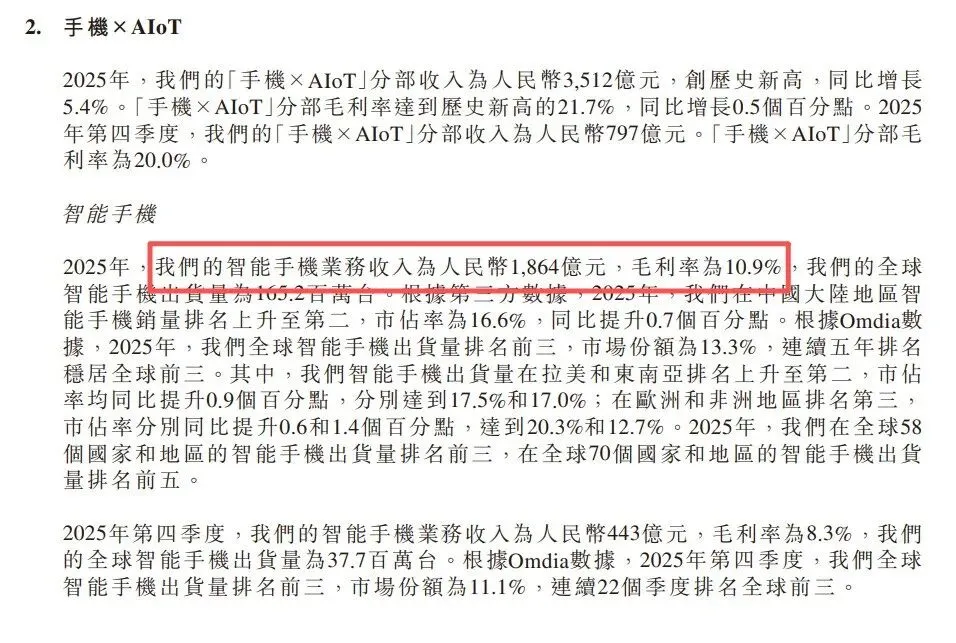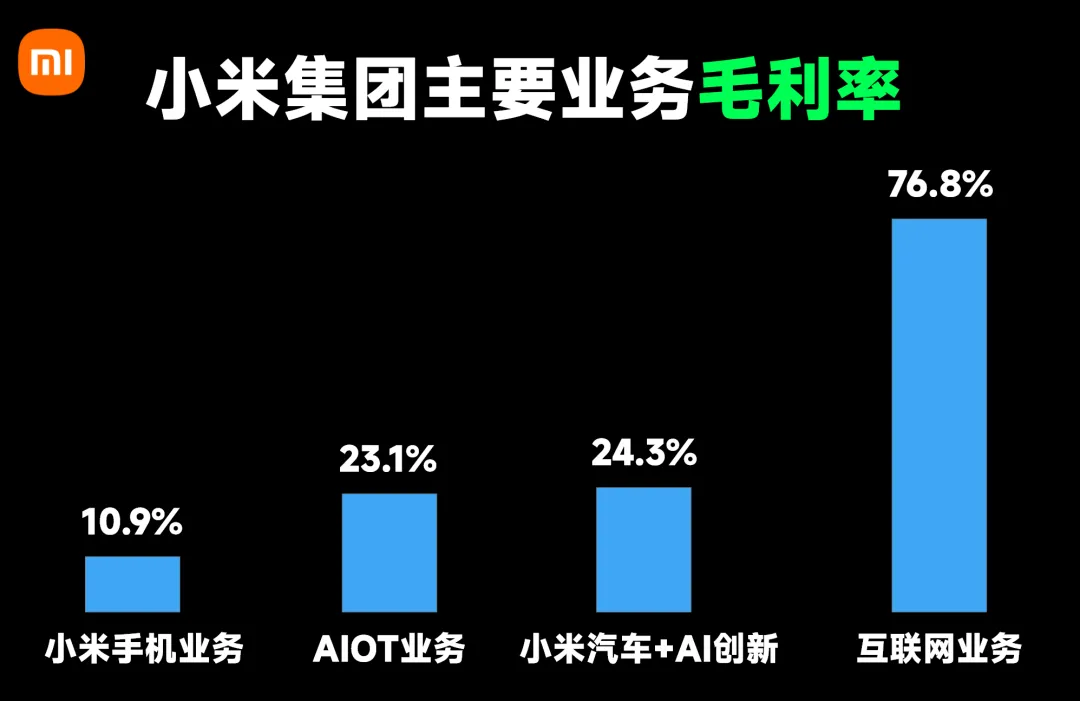 大家应该都知道,到目前为止整个手机行业没有对旗下手机进行涨价的也就只剩下小米、华为和苹果。其中华为和苹果的产品本身利润就比较厚,而且买的最多的也都是高端机,不涨价算是意料之中。因为小米这边实际上和OPPO、Vivo、荣耀是一样的,出货的主力基本都以中端和中低端产品为主。而这部分机器受到这波涨价潮的影响其实是最大的,本次涨价的重灾区其实也就集中在这个价格区间。然而,小米依然能按兵不动,不涨价,这本身就是不那么正常的。2、小米现阶段是在赔本赚吆喝,然后通过其他途径来挣钱。(目的是为了提升自己的市占率)我最近两天也一直在思考这个问题试图找到答案,于是乎我仔细地审阅了一下小米公布的2025年财报的原文。看完之后,还真就让我发现一个真相——小米的手机业务真的不怎么赚钱;在当下大概率是赔钱的,只不过是赔钱多与少罢了。小米财报中关于手机业务这部分是这么描述的:——“2025年,我們的智能手機業務收入為人民幣1,864億元,毛利率為10.9%,我們的全球智能手機出貨量為165.2百萬台。”请注意几个关键词“毛利率10.9%”、“毛利率从2024年的12.6%下降至10.9%”。请一定注意,这还只是毛利率并不是净利润率,按照这个毛利率可以计算出他的毛利大体在203.18亿。这只是毛利,那么净利润大概是多少呢?小米在财报中并未提及。但是大家需要注意的是,小米在2025年的总支出可是750亿元左右,如果按照收入占比来分配成本(小米手机的营收占总营收的40%左右),那么小米单纯的手机硬件业务那是纯纯赔钱的...哪怕你按照30%的比例给小米手机业务分配成本,小米手机也是赔钱的。大家知道苹果的产品硬件的毛利率是多少么?根据财报显示是40.7%。小米手机这个业务,如果独立结算的话,大概率都是纯亏的。那么问题来了,小米到底是咋挣钱的呢?难道真是搁着做慈善的?当然不是。从财报中咱们其实也能非常清楚的看出了,除了小米手机是个赔钱货之外,其他项目的毛利率都不低。依托于小米手机和AIOT业务所产生的互联网服务这个业务的毛利率高达76.8%。小米手机虽然不挣钱,但是互联网业务那是真挣钱而且利润率相当高。这里,小米其实也是故意“鸡贼”了一下,他把新能源汽车业务和AI创新业务放在一起来计算了利润率。众所周知,现阶段的AI业务那都是个赔钱货,属于高研发+低收入甚至是0利润的玩意,比如小米此前推出的小龙虾,现阶段能赚钱么?必然不能。在财务汇算中,这就是一个典型的通过项目杂糅来起到“模糊单一业务真实盈利能力”的一种做法。简单来说,小米新能源汽车的毛利率绝对是高于24.3%,我个人预测,小米汽车这个业务的毛利率大概能达到30%甚至以上。至于为啥现阶段不单独对外披露小米汽车的真实毛利率,我也不太清楚,小米可能有自己的考量。这下大家知道,当年小米为啥敢喊出“小米硬件综合净利润率永远不会超过5%”了吧?因为如果不算汽车业务的话,其他业务单纯汇算硬件业务的净利润率,别说达到5%了,大概率都是赔钱的。而且,大家请注意,当时喊出这个口号的时候,说的可就只是手机和各种AIOT产品,没有包含小米汽车哟。看到这你大概也就能明白,小米为啥敢于按兵不动不涨价了,说白了,小米手机本身就是亏损的,但是只要份额和市场占有率足够高,那么其就能从其他途径赚到钱。小米本质上还是把自己当做了一家互联网企业来看待了。这下大家知道,小米为啥死撑着不涨价的原因了吧?手机业务你随便赔,只要不离谱就行,份额才是第一位的。