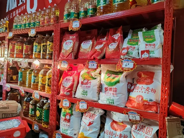 迎宾交易中心以粮油店为主,围绕米面油基础品类,为周边居民提供稳定供应,其中米面恒源香油坊的发达面粉、乔府大院大米,凭借亲民价格获得社区青睐。