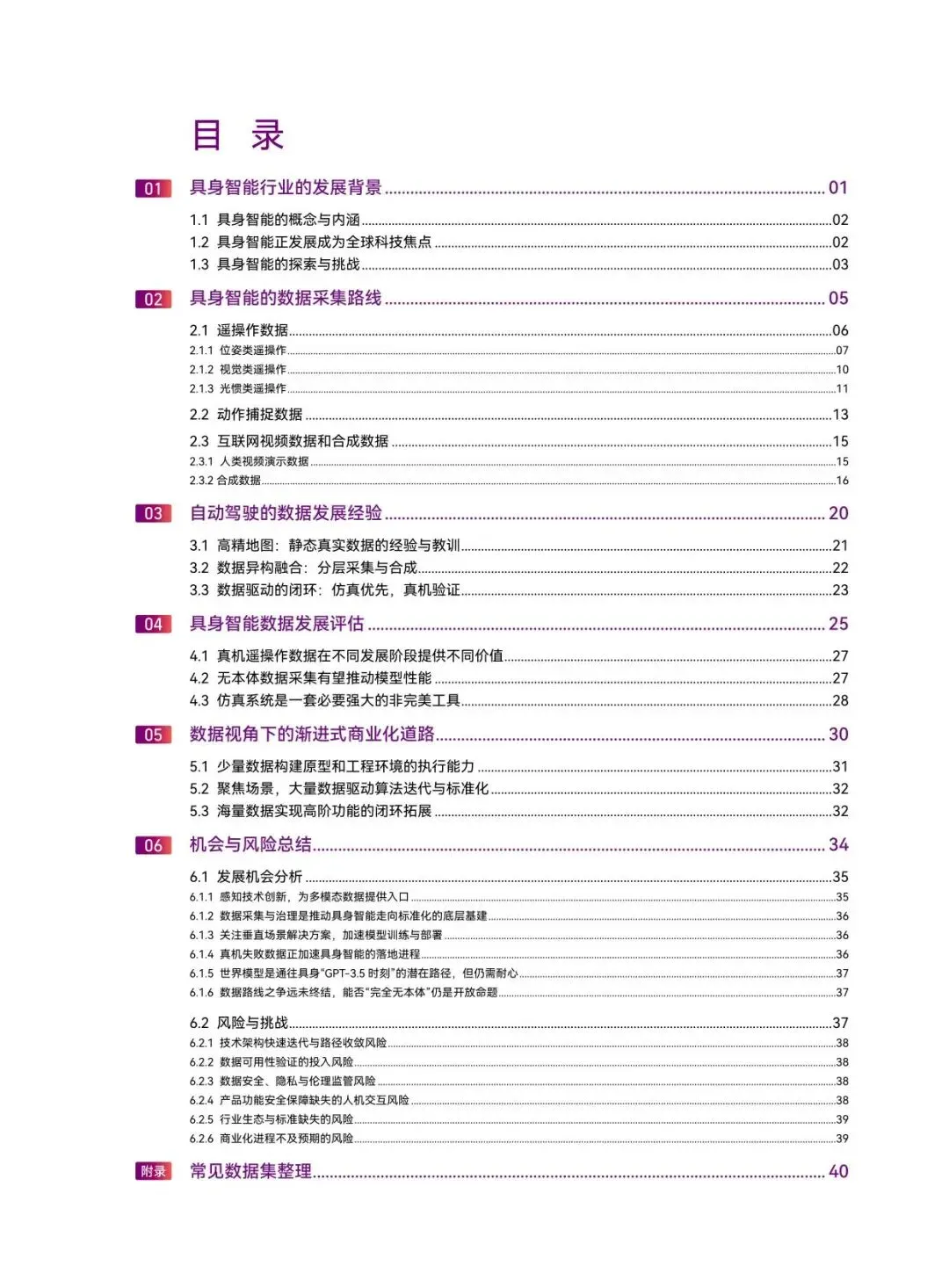 报告最后总结了具身智能数据领域的发展机会与风险。机会方面,感知技术的创新为多模态数据采集打开了新入口;数据采集与治理是行业标准化的底层基建;垂直场景解决方案能加速模型落地;真机失败数据是宝贵的优化资源;世界模型被视为通向通用能力的关键路径。然而,行业也面临技术路径快速迭代与收敛的不确定性、数据可用性验证的高投入风险、数据安全与伦理监管挑战、产品安全保障缺失以及行业生态与标准尚未成熟等多重风险。报告强调,数据技术路线之争远未终结,能否实现“完全无本体”学习仍是开放命题,需要业界持续探索与耐心。