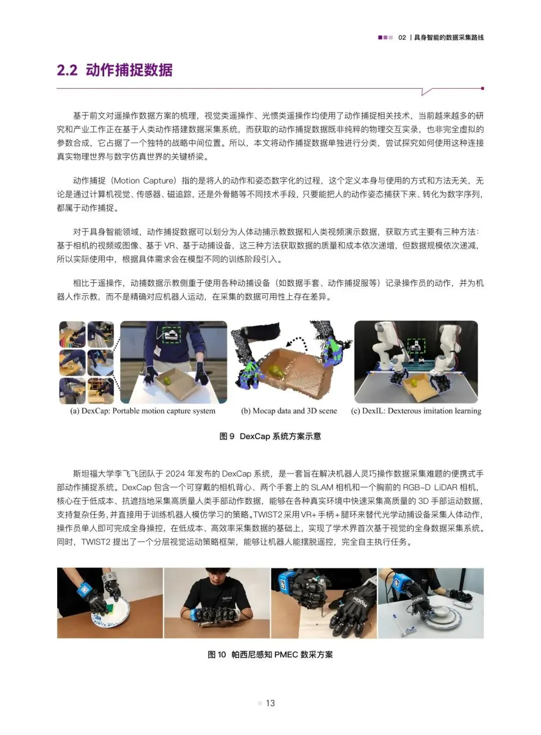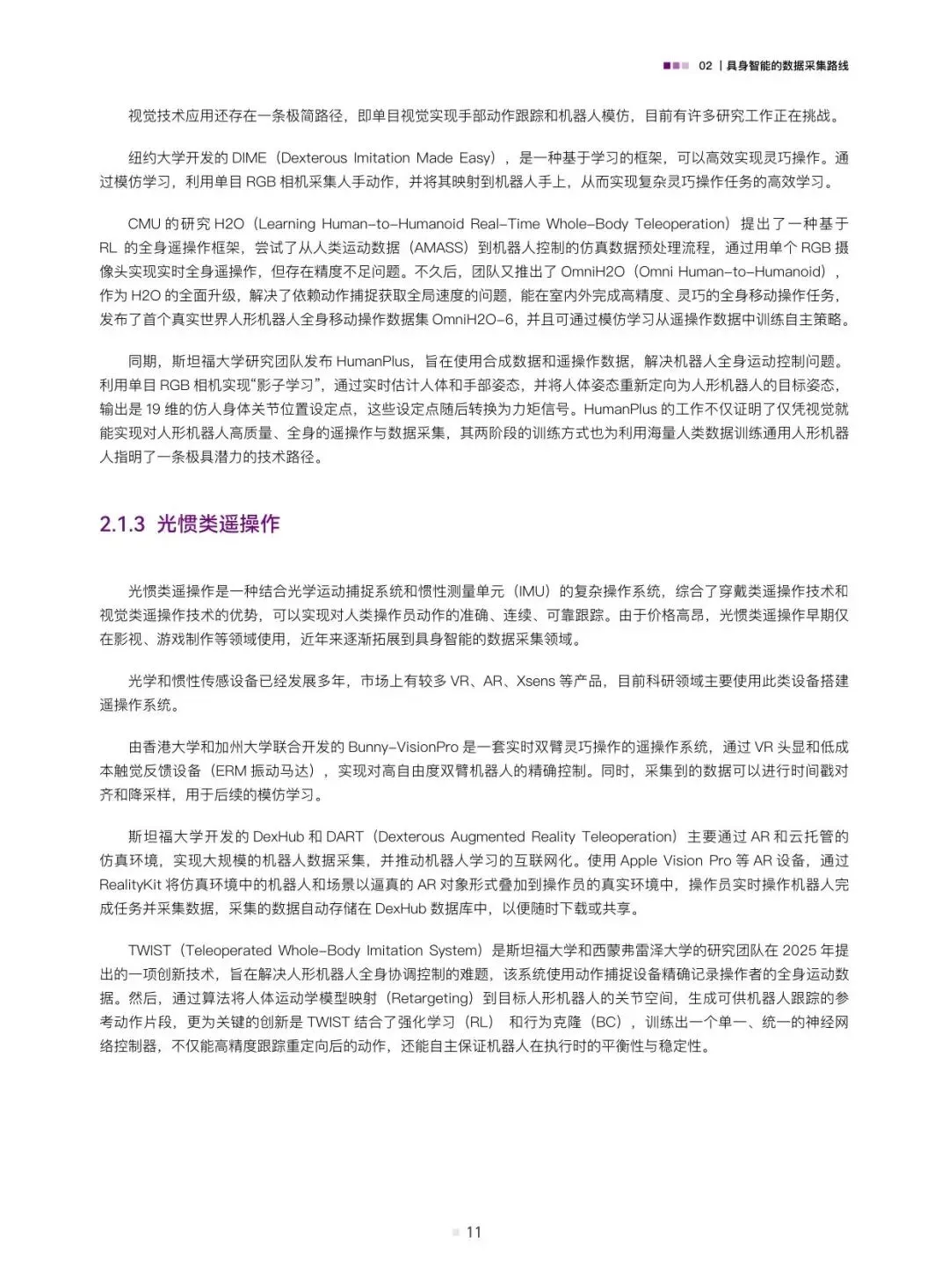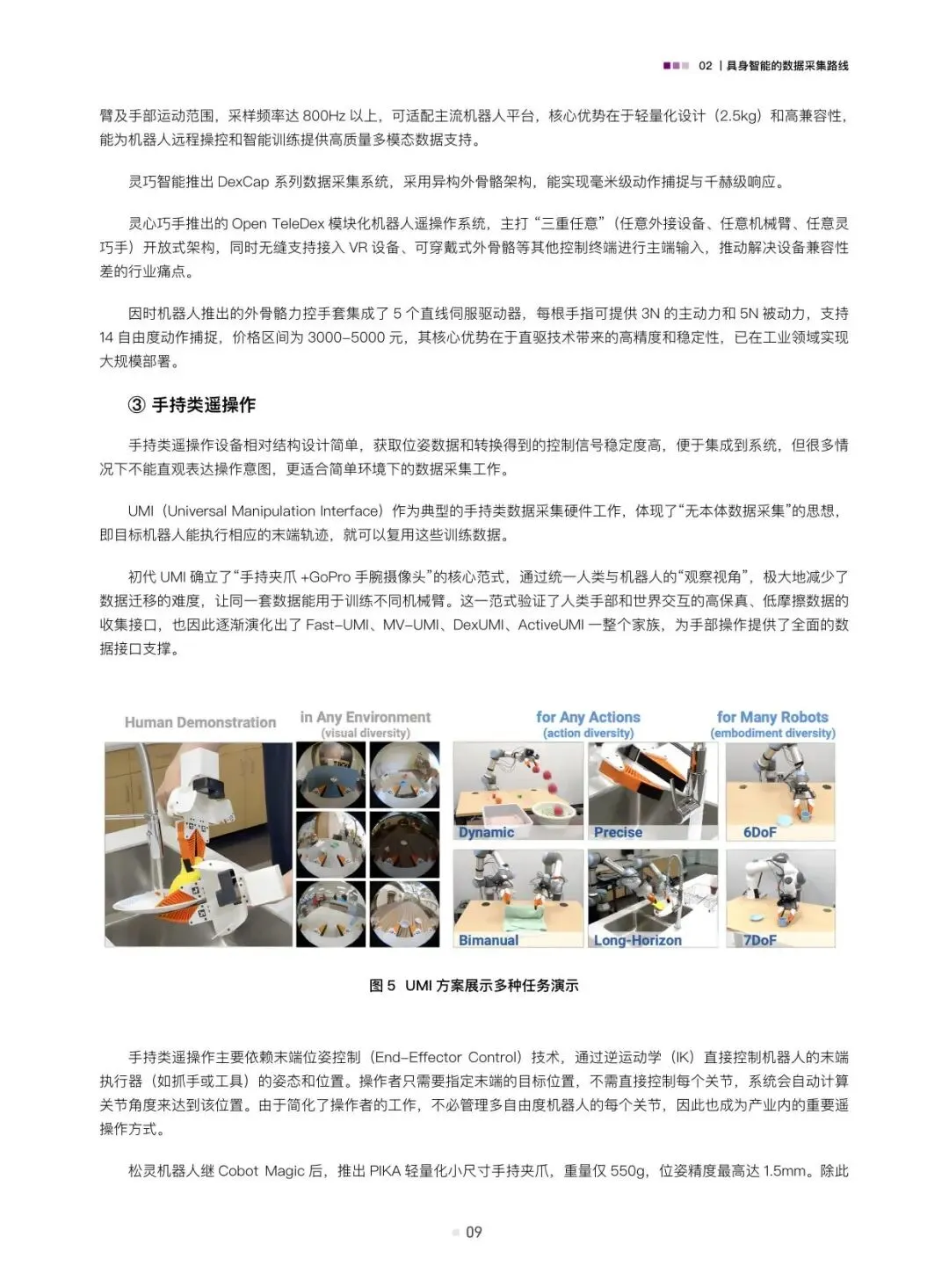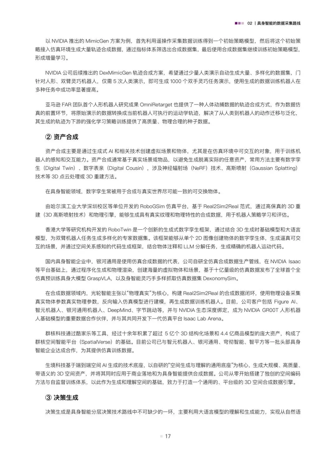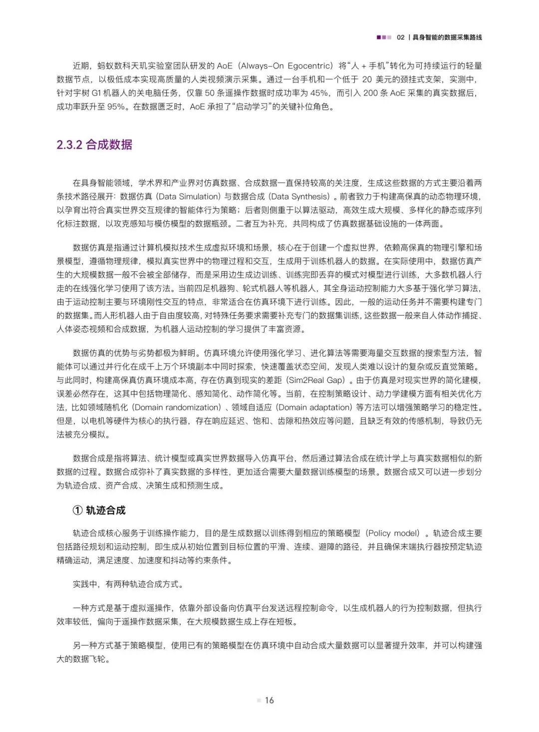 报告详细剖析了三种主流的数据采集路线。遥操作数据是当前获取高质量演示数据的关键手段,具体包括位姿类、视觉类和光惯类遥操作,它们能精确记录人类专家的操作意图与动作细节。动作捕捉数据则侧重于捕捉人体或物体的运动轨迹,为模仿学习提供基础。此外,互联网上丰富的人类视频演示数据以及通过计算机图形学生成的合成数据,正成为低成本、大规模数据来源的重要补充。报告通过案例分析,展示了这些技术在不同场景下的应用与价值。