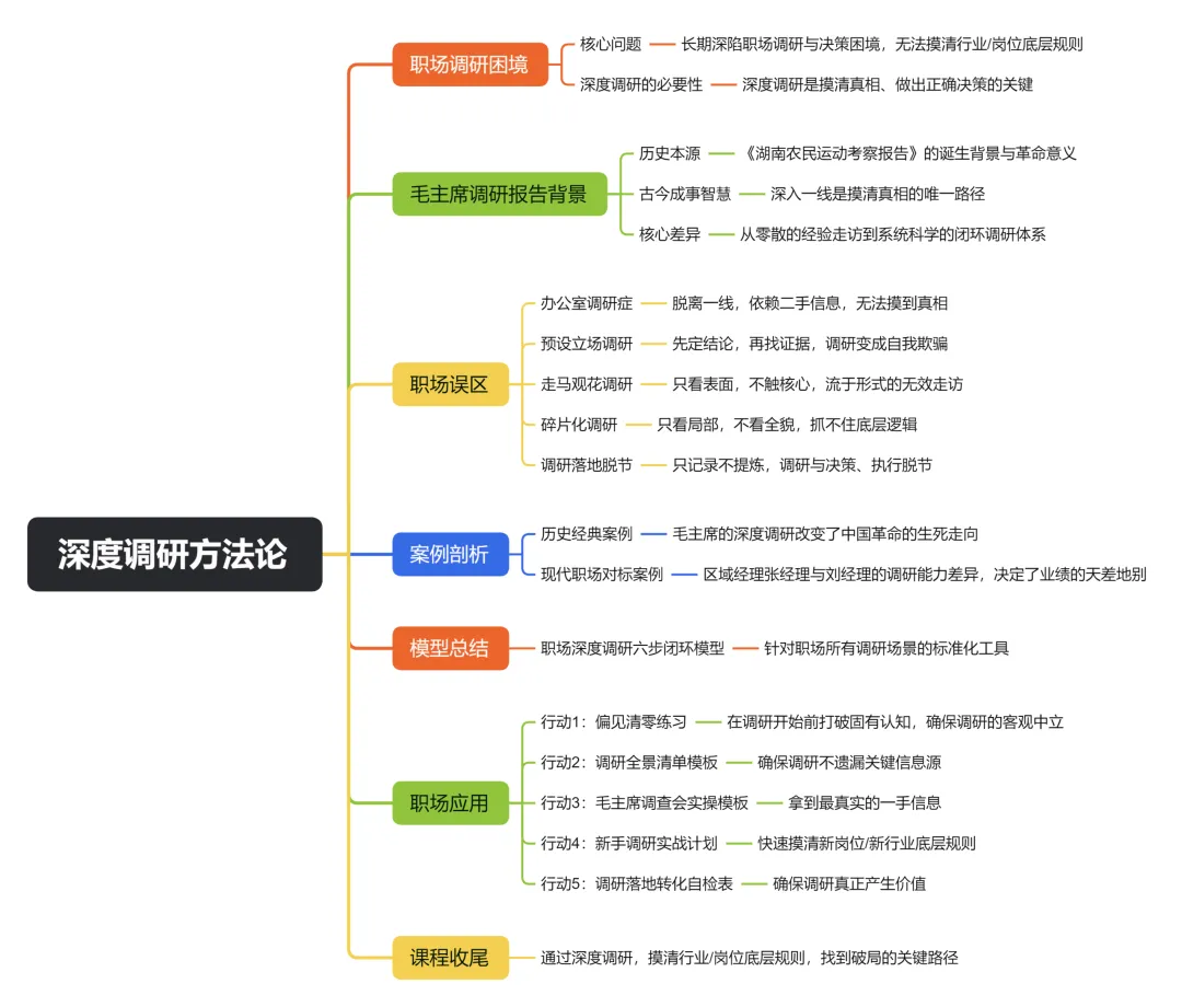 这个模型的核心价值,在于它把毛主席在湖南农民运动调研中用到的所有核心方法,拆解成了职场人可一步步执行的标准化流程。无论你是进入新行业/新岗位要摸清底层规则、做项目要了解用户需求、带团队要排查一线问题、做市场要找到破局点,只要严格按照这个六步模型执行,就能彻底告别无效调研,真正摸到事物的本质和底层规则,做出正确的决策。