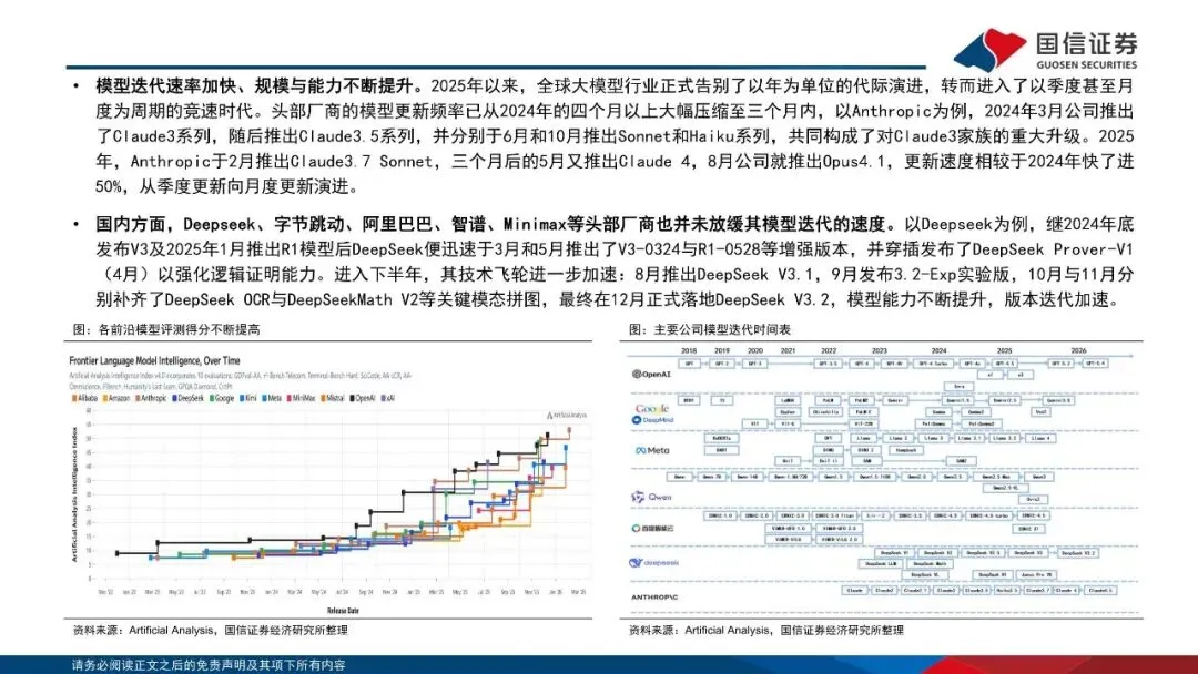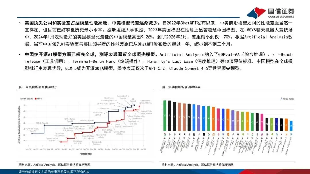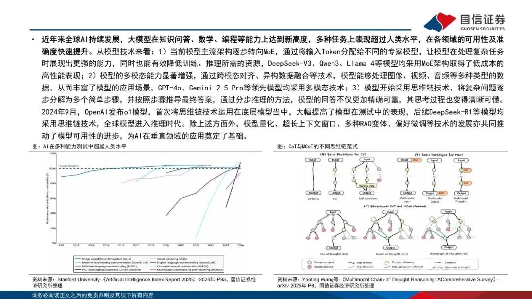 大模型快速迭代,推动应用能力提升。近年来全球AI持续发展,大模型在知识问答、数学、编程等能力上达到新高度,多种任务上表现超过人类水平,在各领域的可用性及准确度快速提升。2025年以来,全球大模型行业正式告别了以年为单位的代际演进,转而进入了以季度甚至月度为周期的竞速时代。同时,美国顶尖公司和实验室占据模型性能高地,中美模型代差逐渐减少。