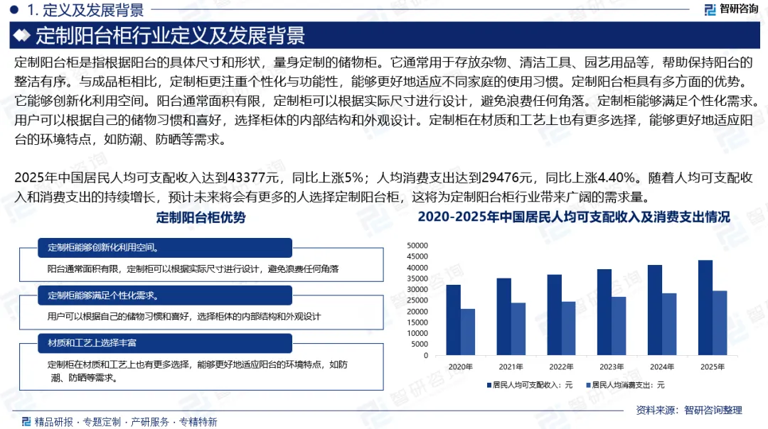 发展背景:在定制家居领域,包括阳台柜在内的非必需品消费,往往对价格敏感度较高。人均收入较高的地区或人群,更有可能承担定制化、个性化产品的溢价,从而推动定制阳台柜的需求。根据国家统计局数据,2020-2025年,中国居民人均可支配收入及消费支出呈现上升趋势,2025年中国居民人均可支配收入达到43377元,同比上涨5%;人均消费支出达到29476元,同比上涨4.40%。随着人均可支配收入和消费支出的持续增长,预计未来将会有更多的人选择定制阳台柜,这将为定制阳台柜行业带来广阔的需求量。