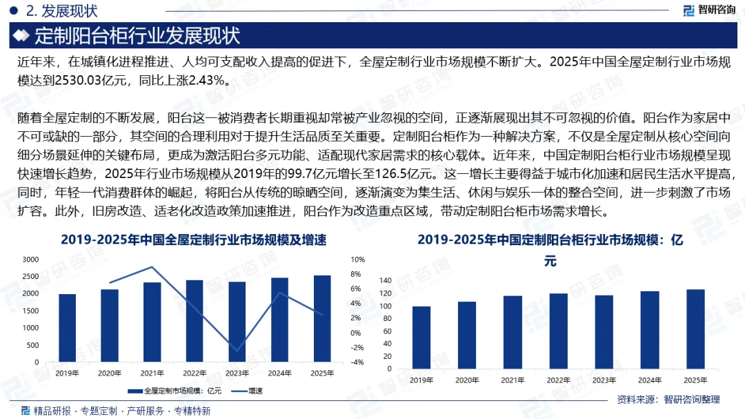 发展现状:近年来,中国定制阳台柜行业市场规模呈现快速增长趋势,2025年行业市场规模从2019年的99.7亿元增长至126.5亿元。这一增长主要得益于城市化加速和居民生活水平提高,同时,年轻一代消费群体的崛起,将阳台从传统的晾晒空间,逐渐演变为集生活、休闲与娱乐一体的整合空间,进一步刺激了市场扩容。此外,旧房改造、适老化改造政策加速推进,阳台作为改造重点区域,带动定制阳台柜市场需求增长。