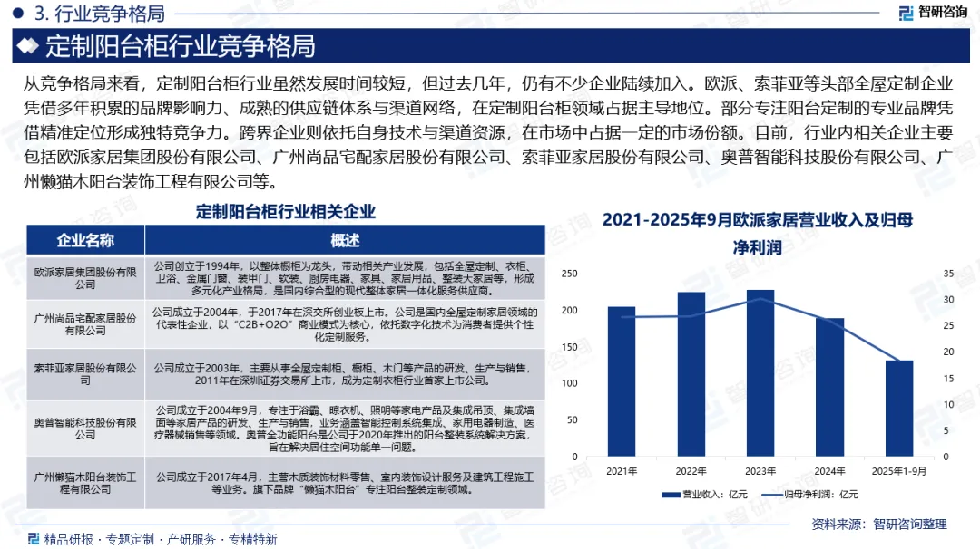 企业格局:从竞争格局来看,定制阳台柜行业虽然发展时间较短,但过去几年,仍有不少企业陆续加入。欧派、索菲亚等头部全屋定制企业凭借多年积累的品牌影响力、成熟的供应链体系与渠道网络,在定制阳台柜领域占据主导地位。部分专注阳台定制的专业品牌凭借精准定位形成独特竞争力。跨界企业则依托自身技术与渠道资源,在市场中占据一定的市场份额。目前,行业内相关企业主要包括欧派家居集团股份有限公司、广州尚品宅配家居股份有限公司、索菲亚家居股份有限公司、奥普智能科技股份有限公司、广州懒猫木阳台装饰工程有限公司等。
