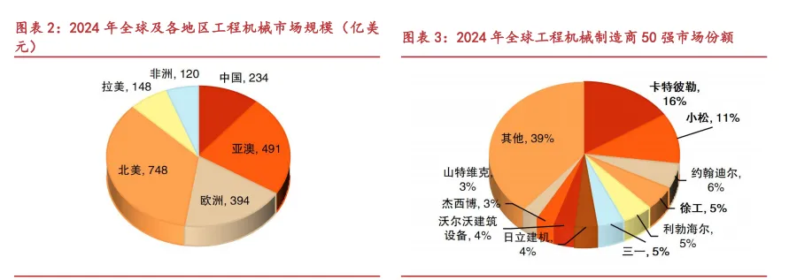 全球工程机械行业规模超万亿元,中国市场占据重要地位。根据弗若斯特沙利文,2024年全球工程机械行业规模达 2135 亿美元,其中北美、亚澳、欧洲、中国、拉美、非洲市场规模分别为 748、491、394、234、148、120 亿美元,其中中国市场占比 11%,北美及欧洲地区组成的海外成熟市场占比 53%,亚澳、拉美、非洲等地区组成的海外新兴市场占比为 36%。