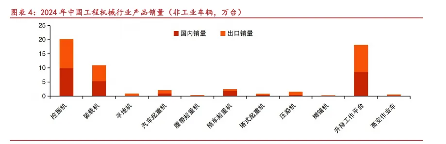 工程机械产品种类繁多,挖掘机械为代表性产品。从数量来看:中国工程机械企业 2024年 12 大工程机械主要品类总销量共计 185.5 万台,其中主要用于工业物流生产的工业车辆销量最高达 128.55 万台。在除工业车辆外的传统工程机械设备中,挖掘机械、升降工作平台、装载机全年销量分别为 201131 台、179927 台以及 108209 台,占非工业车辆工程机械销售总量的 35%、32%以及 19%。从价值量来看:各类传统工程机械产品中,2024 年挖掘机械、装载机、起重机械全球市场规模分列前三位,分别为 632、390 以及 302 亿美元,占全行业市场规模 30%、18%以及 14%。无论从价值量还是数量上来衡量,挖掘机械都是工程机械行业具有重要代表性的产品,是研究行业整体变化重要的参考对象。