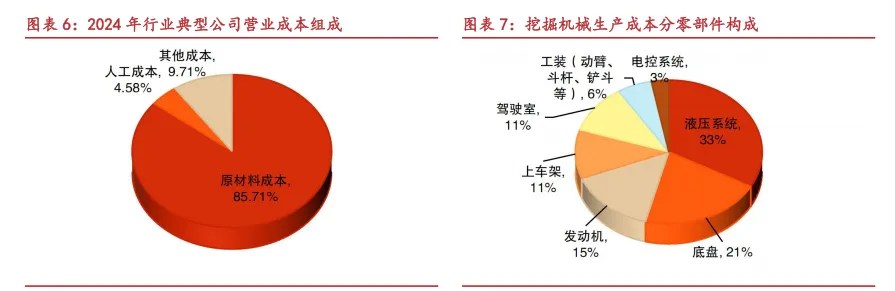 “得液压者得天下”,液压系统是工程机械上游的核心。工程机械行业主要营业成本集中在上游钢材、液压系统、发动机、底盘部件、轴承、轮胎等原材料成本,以行业典型公司徐工机械、三一重工及中联重科 24 年营业成本组成为参考,三家公司合计原材料成本占公司总营业成本比例分别为 85%、84%及 90%,平均占比超 85%。各零部件中,负责将发动机动能传递至工程机械各运动执行元件以实现往复、回转、摆动等动作运转的液压系统是最为核心的零部件,以挖掘机械为例,液压系统在生产成本中占比最大约为 33%,其次为底盘件及发动机等配件。