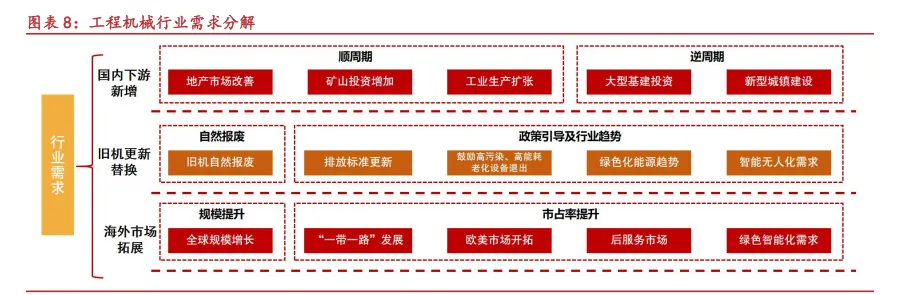 行业需求=国内下游新增+存量设备更新+海外市场拓展。我们对行业下游需求进行梳理拆解,我国工程机械行业需求主要由国内下游新增,存量设备更新换代以及海外市场拓展“三驾马车”拉动: