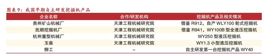 首先是 1949-1960 年的创业起步期,建国前我国没有工程机械制造业,仅有的几个作坊式修理厂,几乎“一穷二白”。宝成铁路、红旗渠等重要基建工程几乎均依靠海量的人力进行施工,为解决相应需求,建筑工程部、铁道部等工业部门开始自行生产一些简单的工程机械并取得一些进展,其中包括 1954 年我国第一台机械式单斗挖掘机试制成功,1957 年首台塔式起重机研制成功等。行业在 1961-1978 年进入初步发展期,标志为 1961 年工程机械局成立,负责全国工程机械的发展和规划工作,我国工程机械行业从此实现有组织的统一管理。这一期间诞生了我国首台履带式液压挖掘机、汽车起重机等,并成立了专门的全国性工程机械研究机构-天津工程机械研究院。