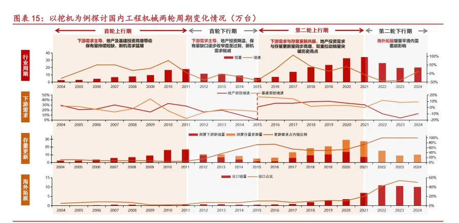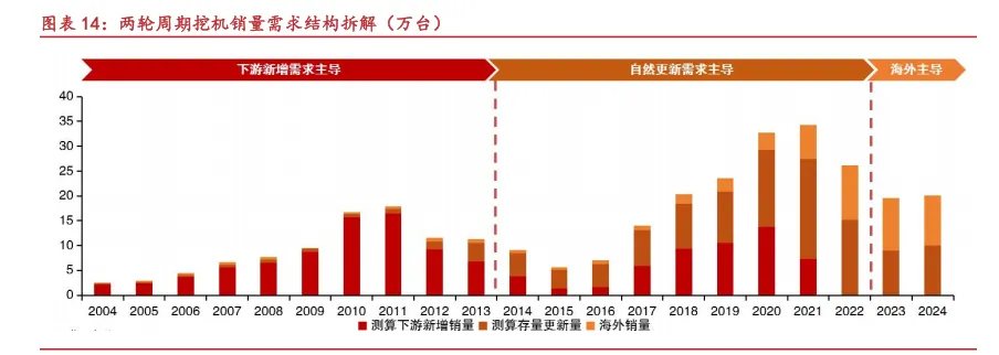 通过拆解计算行业需求结构:2004-2011 年第一轮上行周期,下游新增需求是销量增长的主要驱动因素,2011 至 2015 年的下行周期中,更新需求逐渐增长与下游新增需求共同影响销量;2015-2021 年第二轮上行周期,存量更新开始成为行业销量的主导因素,同时下游新增需求与海外需求同步发力,带动周期上行;2021 年后的下行周期中,下游新增需求锐减,海外需求与存量更新成为拉动销量的主导因素。