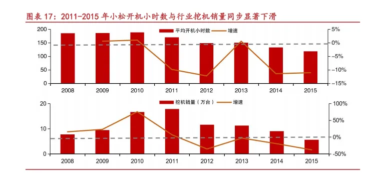 首轮下行周期(11-15 年):在国家大规模基建刺激政策力度逐渐减弱以及为遏制房价增长过快出台“国十条”等房地产限购政策的背景下,下游投资增速迅速滑落,尤其是对行业销量影响较大的房地产行业,投资增速从 2011 年的 28%迅速滑落,至 2015 年已不足 1%。从可以直接反映实际工作需求量的小松挖掘机开工小时数来看,2011 年月平均开工小时数从170.58 小时迅速下降至 2015 年的 119.13 小时。因此挖机销量也从 11 年最高峰的 17.84 万台,迅速回落到 15 年 5.6 万台,降幅超 68%。