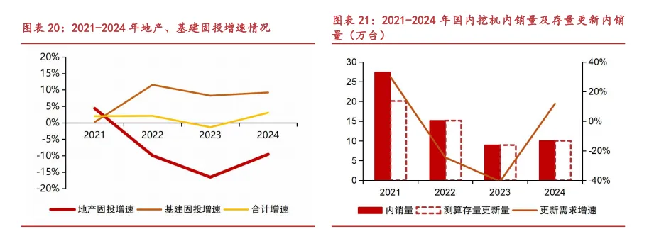 第二轮下行周期(21 年至 24 年):2020 年“三道红线”政策出台,大量房地产企业融资受限,资金链压力持续紧张,开发能力和意愿急速下降。同时叠加人口负增长及城镇化率逐渐步入高位等因素,工程机械主要下游地产及基建行业的整体固投增速维持在 5%以下,尤其房地产行业固定投资从 2022 年开始持续保持负增长,因此下游新增需求持续低迷。同时存量更新需求量也随着更新高峰的结束,从 2021 年 20 万台的顶点下滑到 2024 年 10 万台的低位。在下游新增与存量更新需求的双重下滑之下,2021 至 2024 年间,挖机国内销量从 27 万台快速下滑至 10 万台,跌幅达 63%。