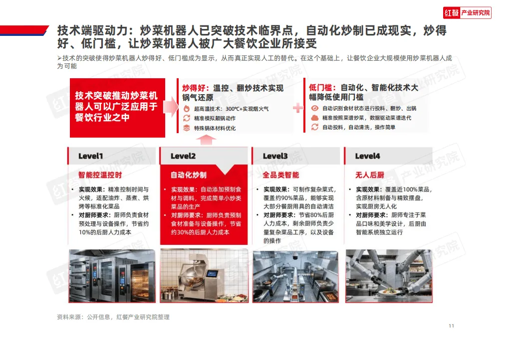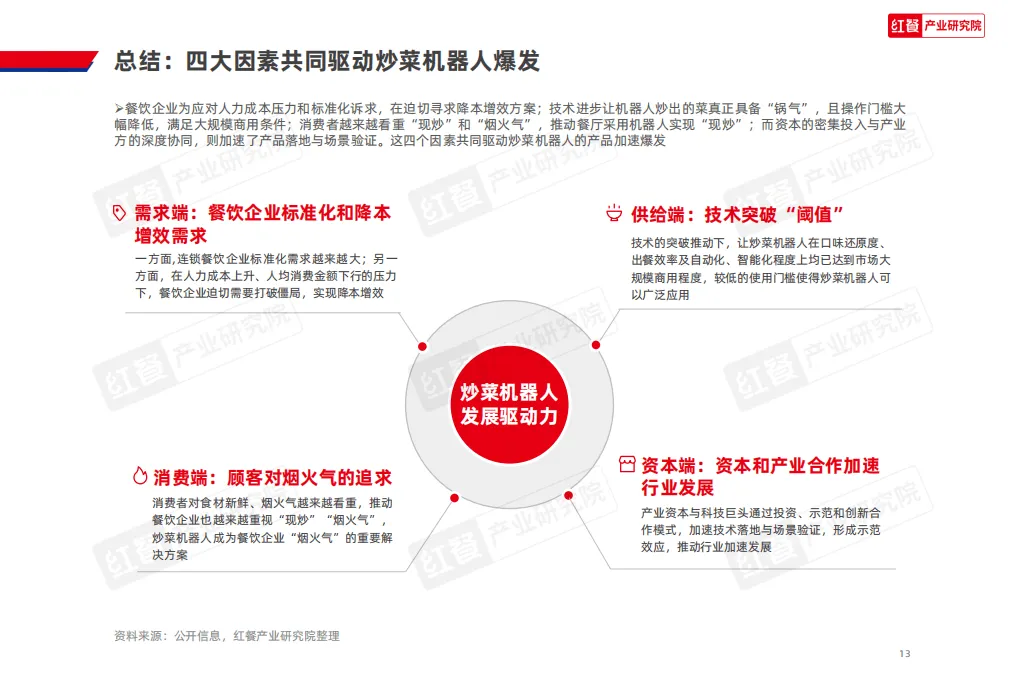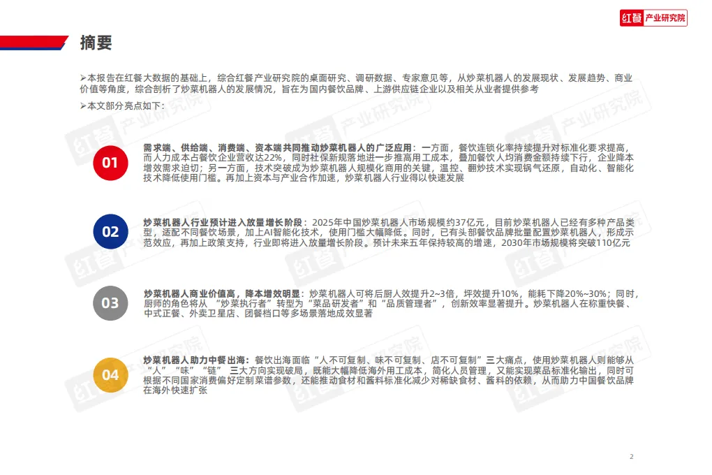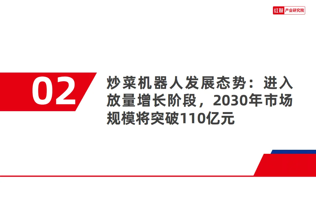 2026年餐饮AI炒菜机器人研究报告指出,在需求、供给、消费、资本四大端共同推动下,该行业已迈入放量增长阶段,成为餐饮行业降本增效、实现标准化与全球化的核心抓手,商业价值与发展潜力显著。