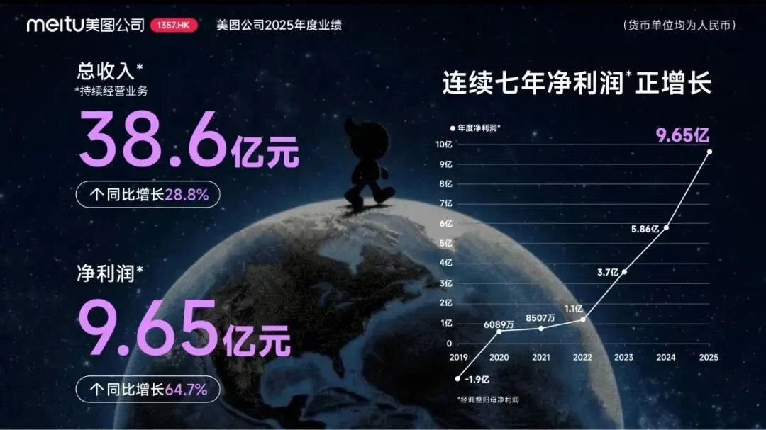 3月27日,美图公司(1357.HK)正式发布2025年度业绩报告。财报数据显示,公司在AI技术的强力推动下,业绩实现强劲增长——全年总收入达38.6亿元,同比增长28.8%;经调整归母净利润达9.65亿元,同比大幅增长64.7%,创下历史新高。