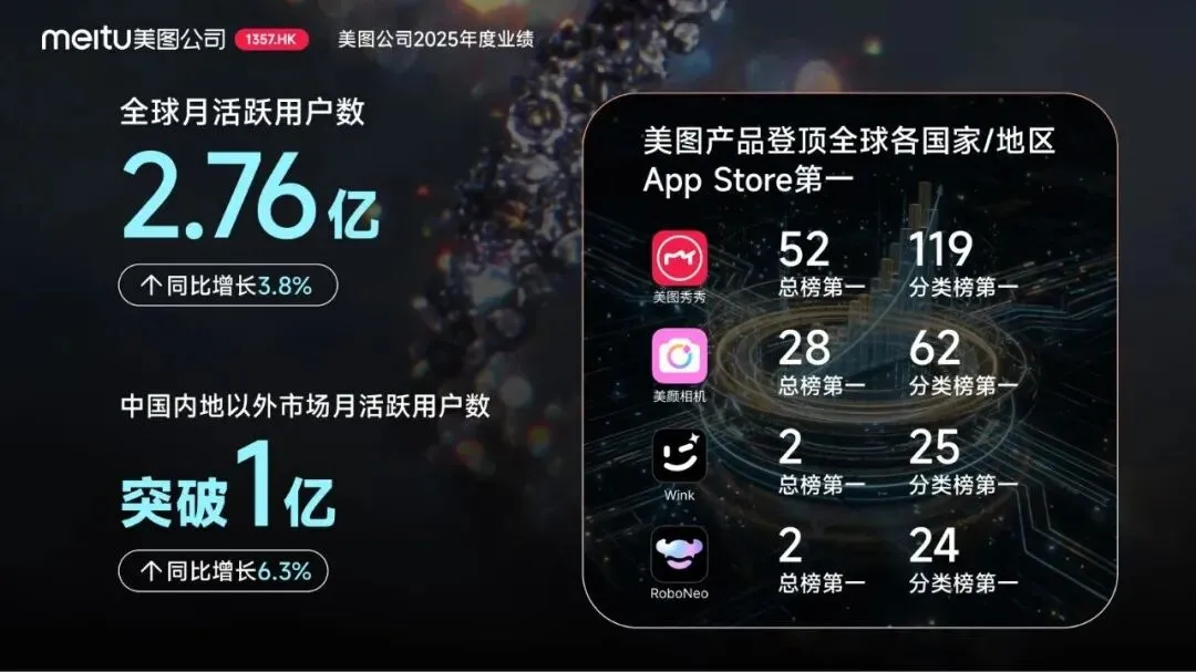 在国际化方面,美图公司的全球化战略成效显著。2025年,美图生活场景产品带动国际市场月活跃用户数突破1亿大关。