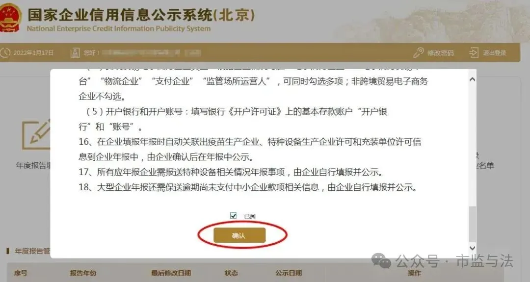 弹出年报须知,阅读后,在下方“已阅”前的小框内“∨”(对勾),再点确认。如果以前存在没有参加年报的年度,先需要将以前年度补报后才可申报本年度的。