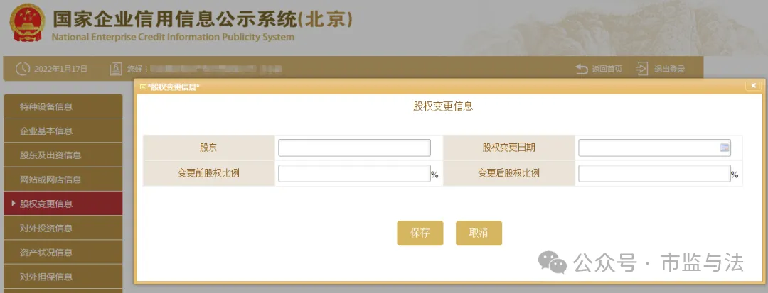 五、填写股权变更信息,点击左边的“股权变更信息”,之后再点击“保存”如未发生过股权变更的则无需填写此项信息。