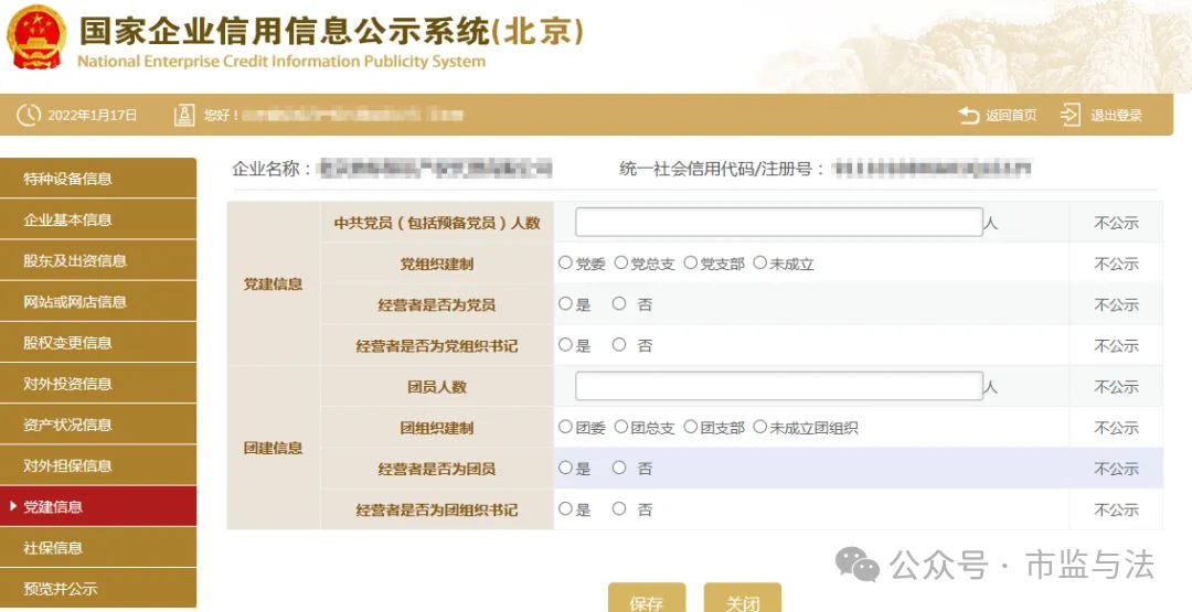 九、填写党建信息。党建信息为不公示信息,主要采集私营企业党组织的建立情况,但属于抽查范围,请注意如实填写。其中,中共党员(包括预备党员)人数,为截至年度报告年份12月31日的人数。如企业暂无党员,填写“0”人后点击保存即可。