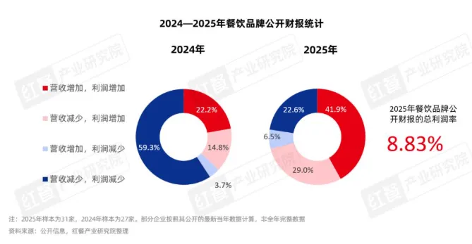 盈利结构优化:这是最关键的反转信号!2025年餐饮品牌盈利大幅改善:“营收、利润双增”的品牌占比从22.2%升至41.9%,“营收减、利润增”的占比从14.8%升至29%;而“双减”品牌占比从59.3%骤降至22.6%,行业总利润率达8.83%,企业盈利能力显著增强。
