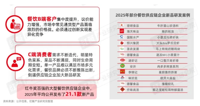 一方面,B端餐饮品牌集中度提升,议价能力增强,传统通货产品陷入价格战,供应链企业只能靠“新品创新”突围——红牛奖百强供应链企业,2025年平均发布21.1款新品(如澄明食品牛肝菌山珍汤料、仟味高汤姬松茸菌汤),靠新品拿溢价、分散风险。