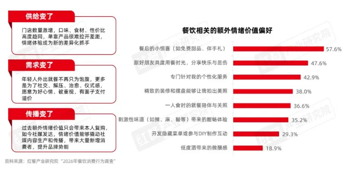 情绪价值成破局关键:供给端同质化严重,需求端年轻人用餐更追求社交、解压、仪式感,愿意为“好心情”付费。数据显示,餐后小惊喜(57.6%)、好友陪伴(47.6%)、个性化服务(42.9%),是最受欢迎的情绪价值来源。