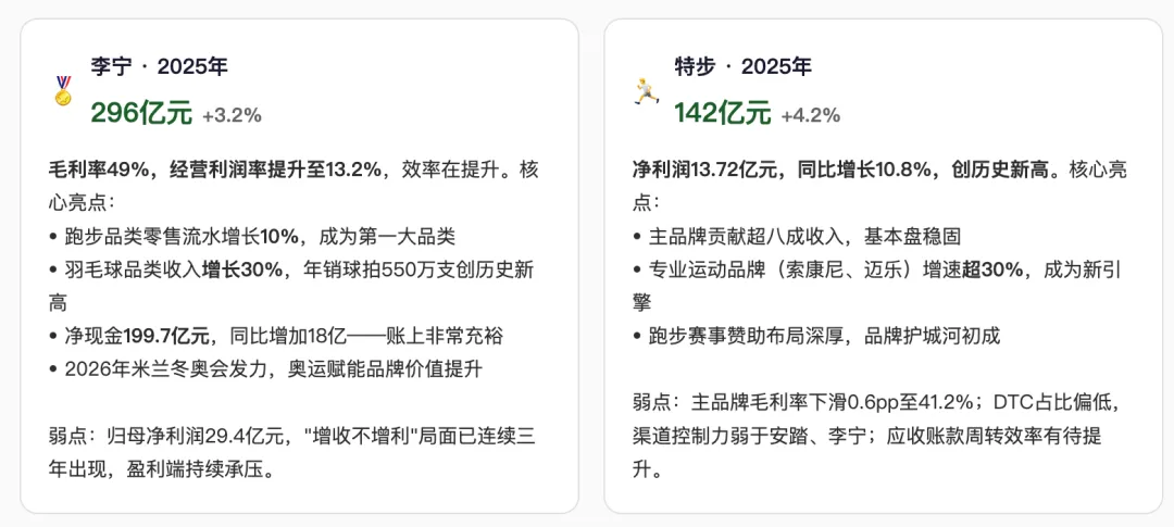 李宁和特步2025年增速都在3%-4%区间,放在一起对比很有意思——同样是"稳",打法和成色截然不同。