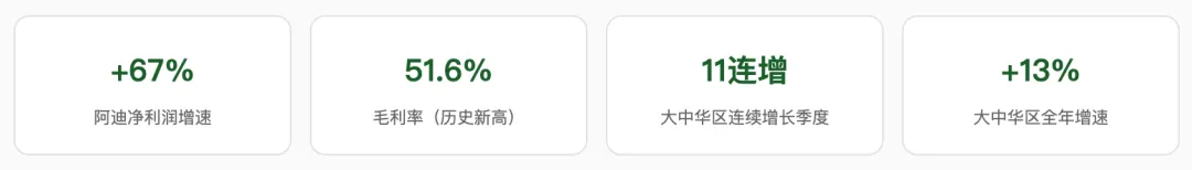 阿迪达斯的复苏不是靠一款Samba,而是完整的产品、渠道、组织三重重建。跑步系列(ADIZERO 0)增速超30%,服装品类增速15%,大中华区连续11个季度增长……这是一家公司系统性修复后的整体爆发,而非昙花一现。2026年展望依然乐观:预计全年营收高个位数增长,利润率目标突破10%。