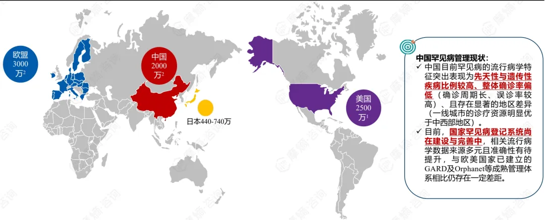 :中国罕见病患者总数估计 超过2000万,是全球罕见病患者最多的国家之一(欧盟约3000万,美国约2500万)。