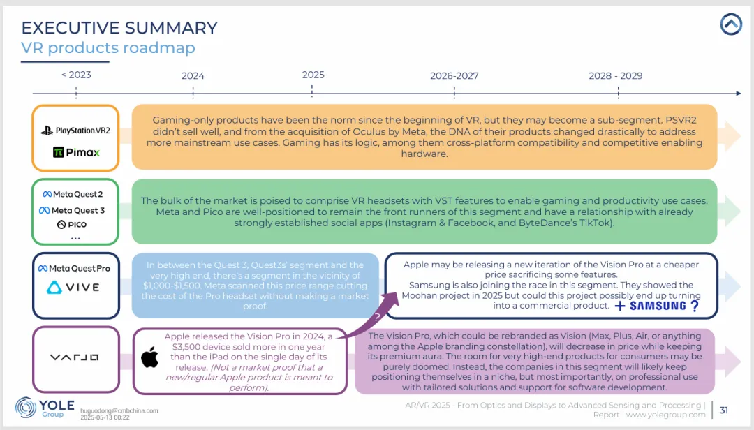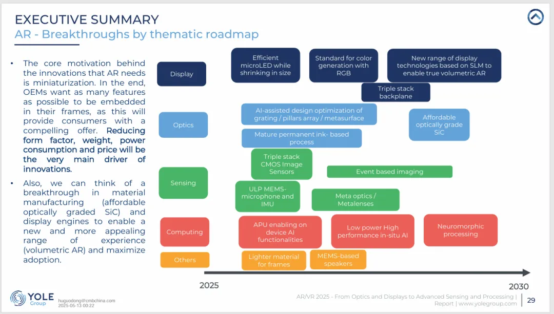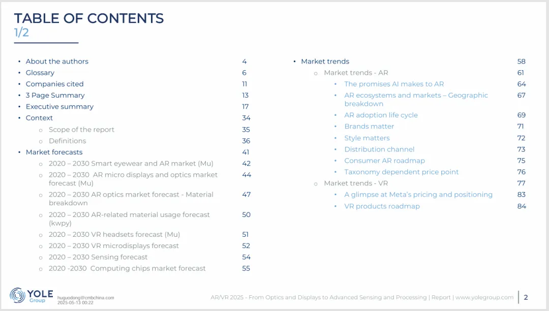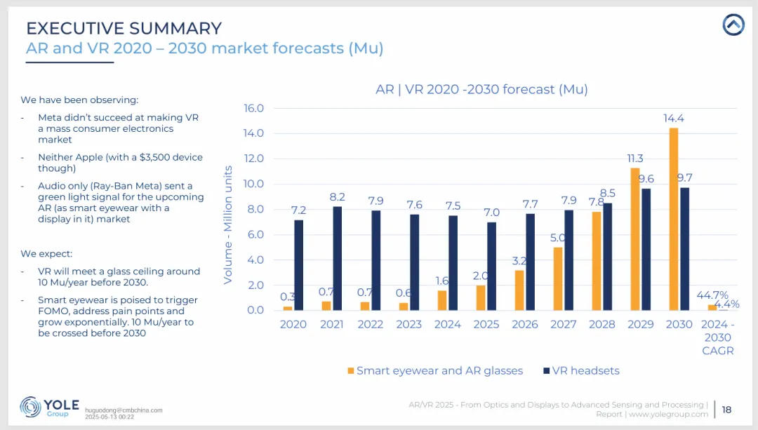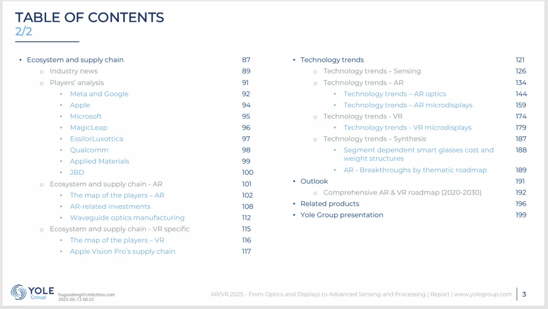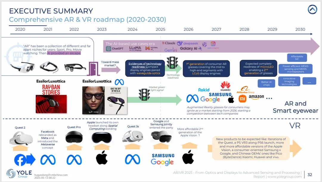 该报告由Yole Group发布,全面分析了增强现实(AR)与虚拟现实(VR)市场的技术路径、供应链格局及未来趋势,重点聚焦于光学、显示、传感与计算芯片等核心模块。