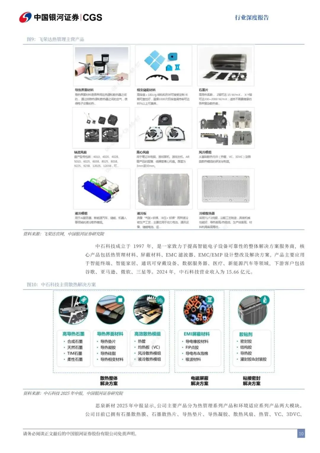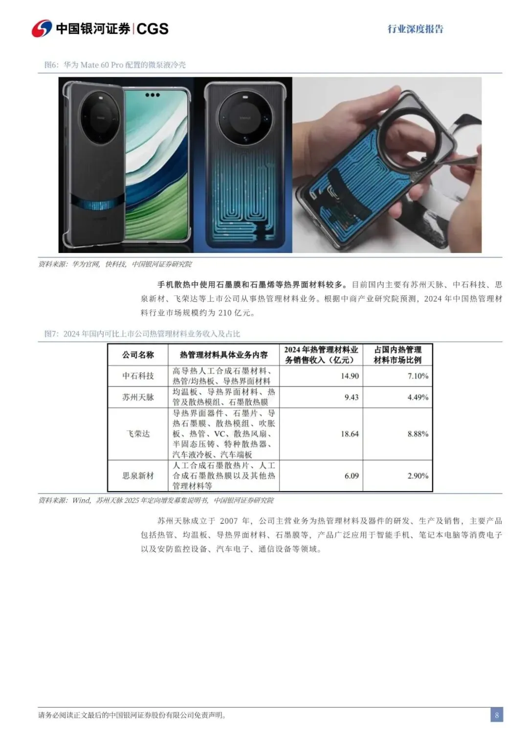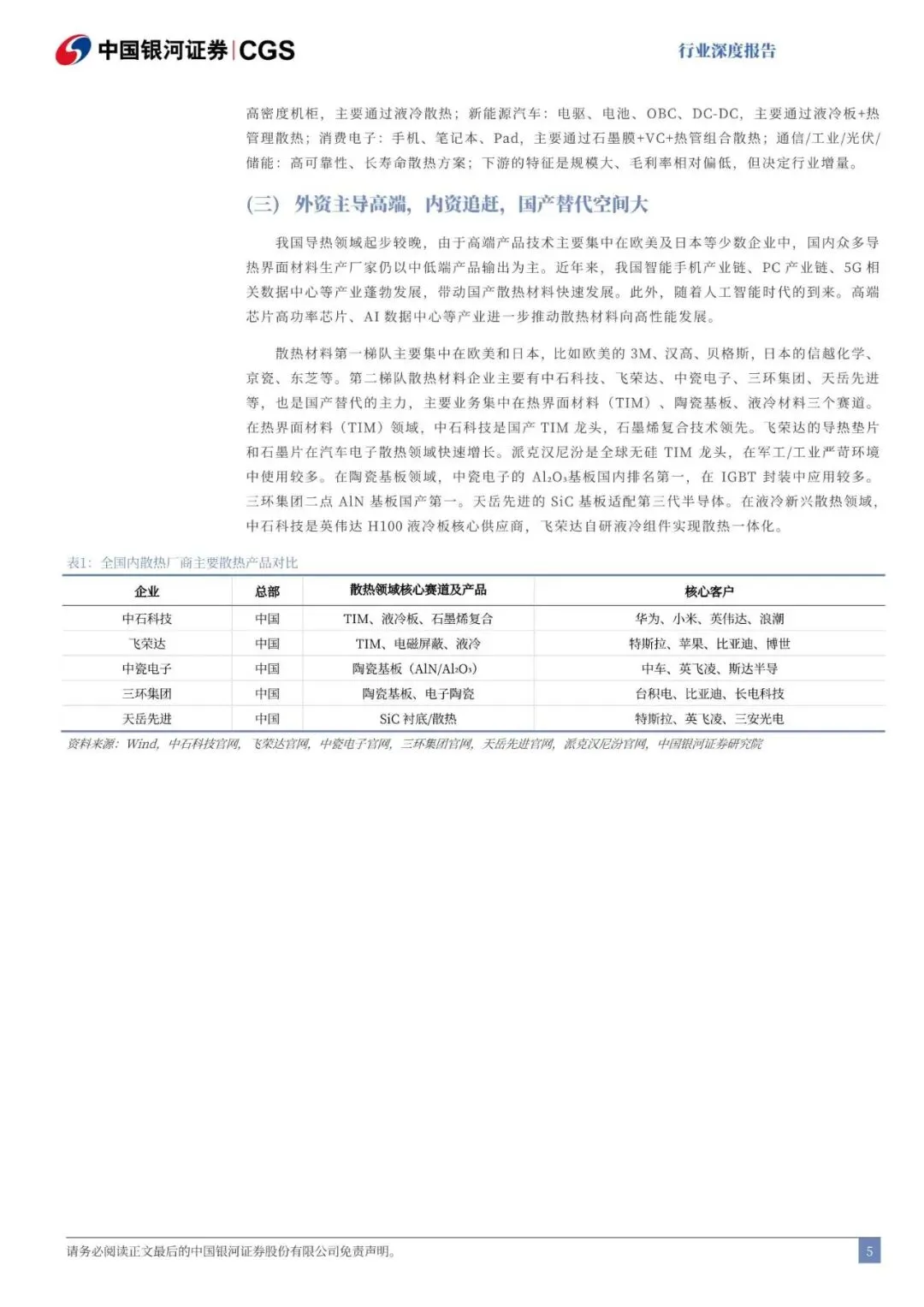 中游价值量最大、竟争激烈。下游主要是终端应用。散热材料第一梯队主要集中在欧美和日本,比如欧美的3M、汉高,日本的信越化学、京瓷等。第二梯队散热材料企业主要有中石科技、飞荣达、中瓷电子、三环集团、天岳先进等,主要业务集中在热界面材料(TIM)、陶瓷基板、液冷材料三个赛道,国产替代空间大。
