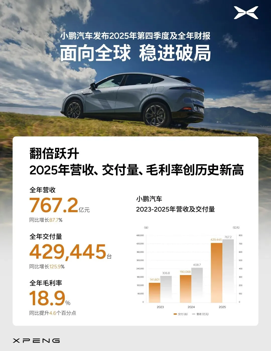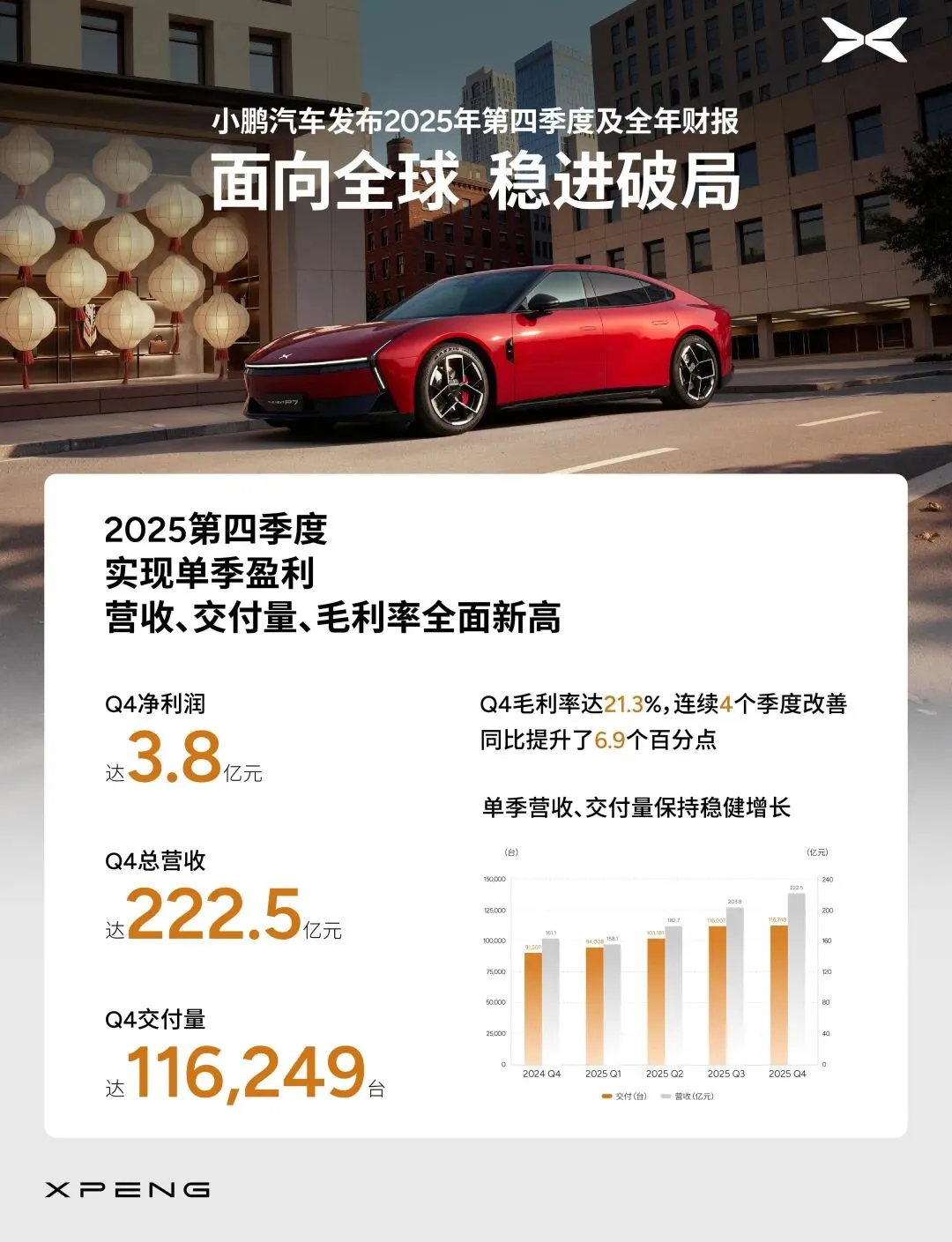 小鹏汽车发布第四季度财报,实现季度盈利Q4盈利3.8亿元。