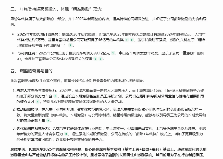 未来,长城汽车的薪资体系结构也要发生调整,如下AI给出的答案: