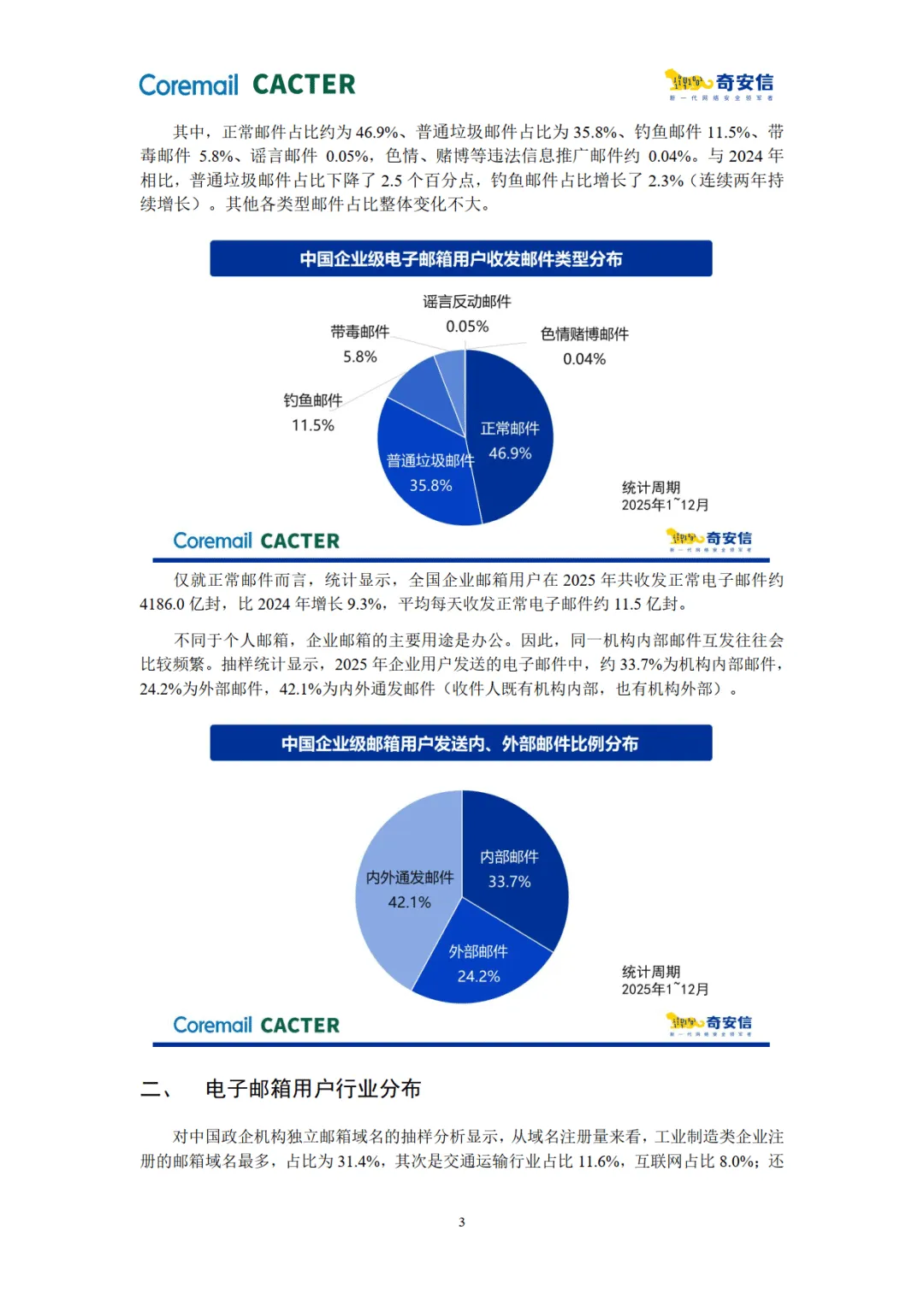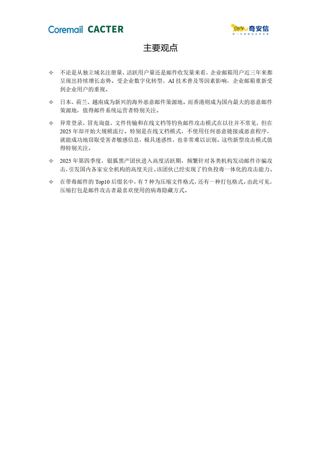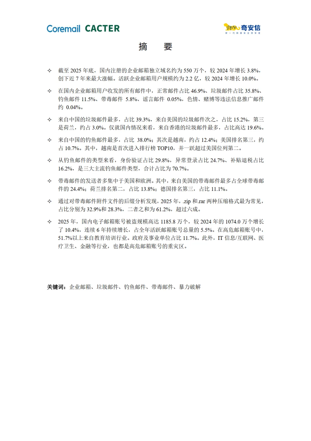 报告由 Coremail 与奇安信联合发布,基于 2025 年企业邮箱安全监测数据,展现了企业邮箱使用量增长下的多重安全风险,揭示了恶意邮件攻击的新特征、新策源地及典型黑产团伙行为,同时给出了风险趋势与防护方向。