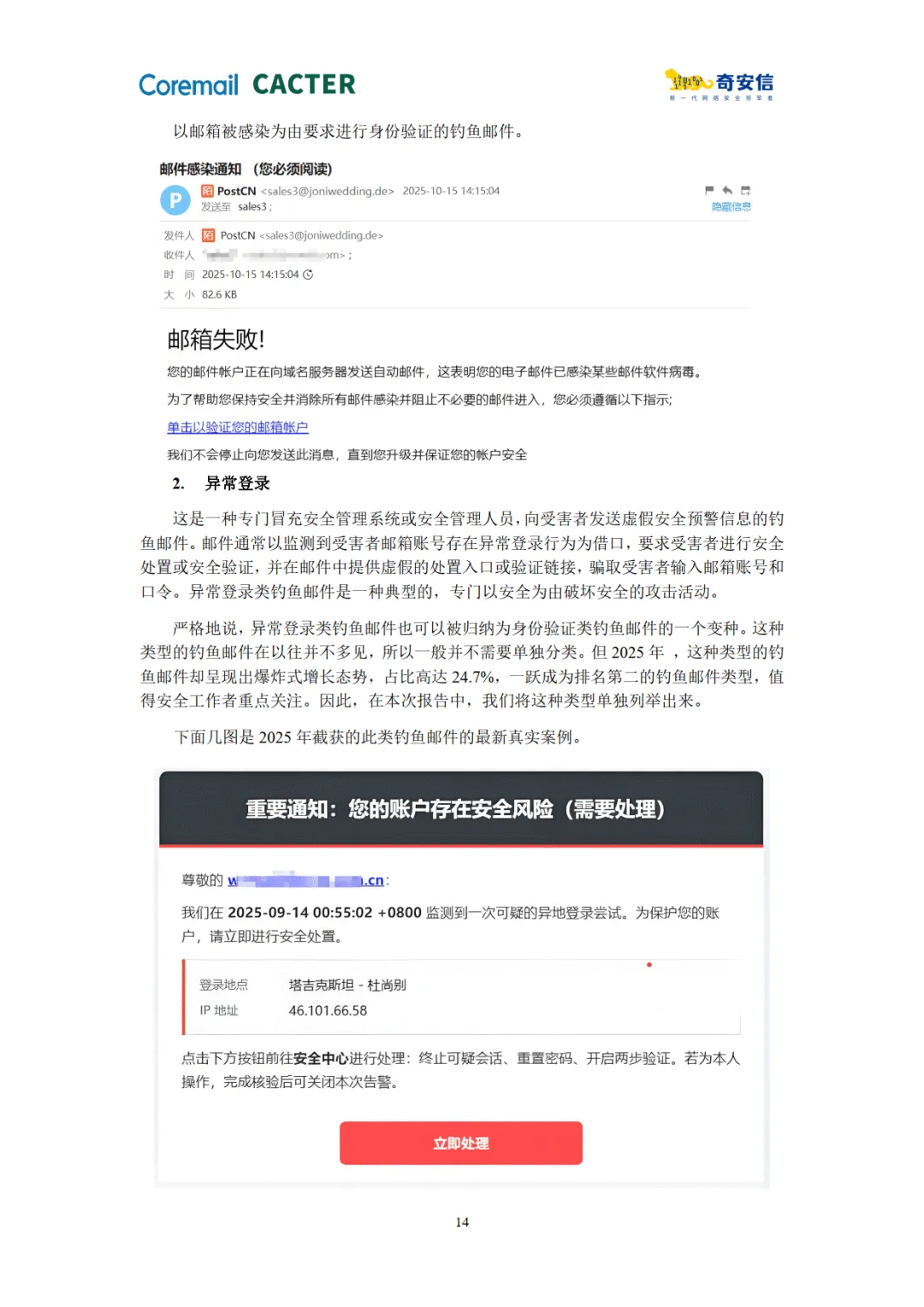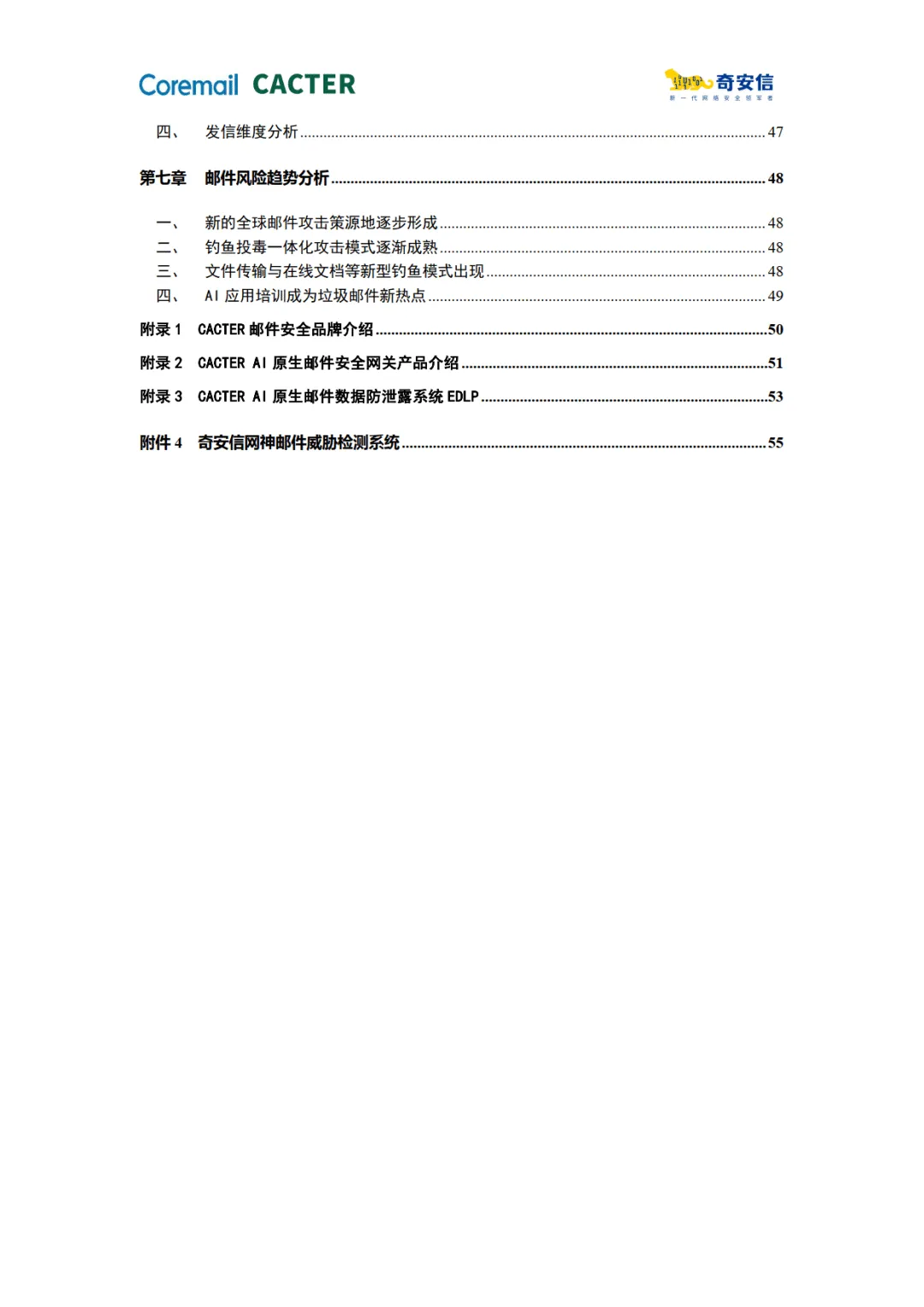 报告指出,2025 年企业邮箱安全呈现四大趋势:新的全球攻击策源地形成、钓鱼投毒一体化模式成熟、文件传输 / 在线文档新型钓鱼爆发、AI 应用培训成垃圾邮件新热点。对此,报告配套介绍了 CACTER AI 原生邮件安全网关、EDLP 数据防泄露系统及奇安信邮件威胁检测系统等解决方案,通过 AI 语义识别、多模态检测、域内威胁处置等技术,构建全域全链路的邮件安全防护体系。