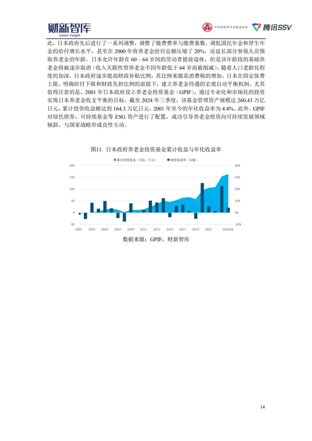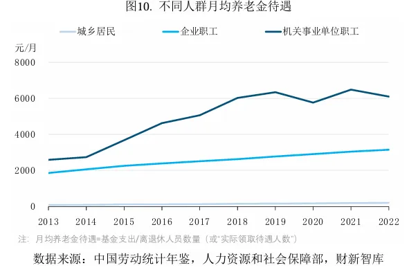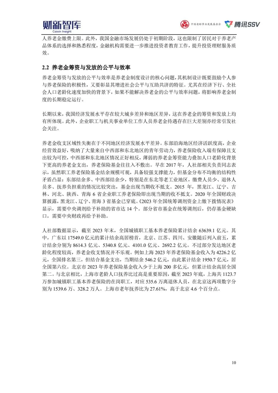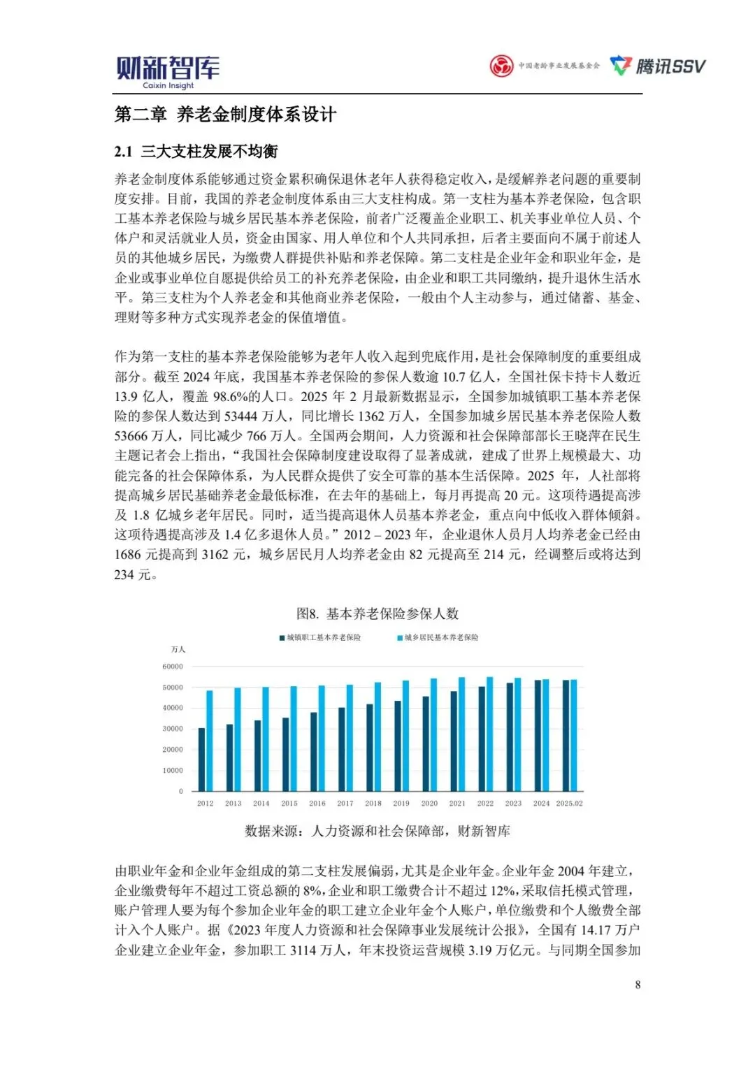 专注金融保险行业研报解读为你提炼最有价值的数据与观点 截至2024年底,中国60岁及以上人口达3.10亿,占全国22.0%;65岁及以上人口2.20亿,占15.6%,较2010年提升6.7个百分点。未来10年内,60岁以上老年人口每年净增超1000万人。 新出生人口从2016年的1883万降至2023年的901万,降幅超50%。过去十年间,15-64岁劳动年龄人口缩减4743万人。 中国2000年进入老龄化(65岁+占7%),2021年升至14%以上,仅用21年,快于日本(26年)。2021年进入中度老龄化时,人均GDP不足1.3万美元,远低于日本(4.0万)、韩国(3.5万)。 2023年社保基金收入11.32万亿,支出9.9万亿,支出占收入比重达87.7%,较2012年提升11.8个百分点。基本养老保险收支占比达89.1%。 2023年社保财政补贴24271亿元,占社保收入21.4%,2015-2023年均增速12.4%。 第一支柱基本养老保险参保10.7亿人,覆盖98.6%人口。企业退休月均养老金从2012年1686元升至2023年3162元,城乡居民月均仅214元。 第二支柱企业年金仅3114万人参加,覆盖率6.76%。2022年机关事业单位月均养老金6099.8元,企业职工3148.6元,城乡居民仅204.7元。 第三支柱个人养老金开户超7000万人,但实际缴存仅占开户两成,人均缴存约2000元,远低于上限1.2万/年。 养老金区域失衡严重:广东累计结余17549亿居首,需中央调剂补助的省市达14个。 《中国劳动统计年鉴》,2014年机关事业单位和企业职工退休者月均养老金分别为2741.5元和2063.9元,2022年,两者分别为6099.8 元和3148.6元,差距扩大至两倍。