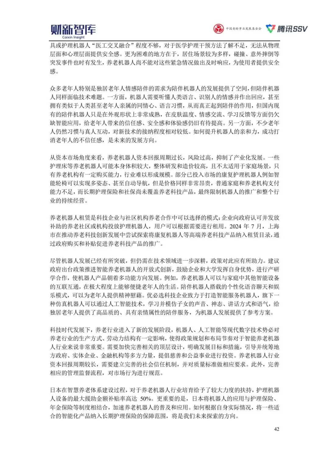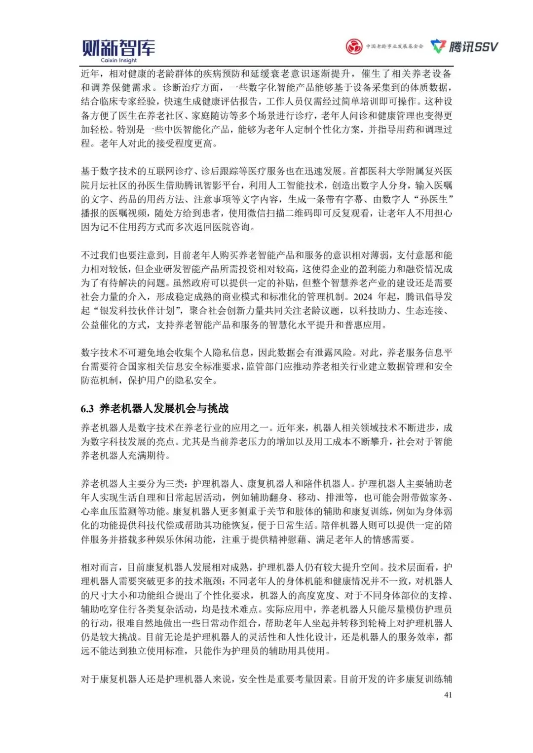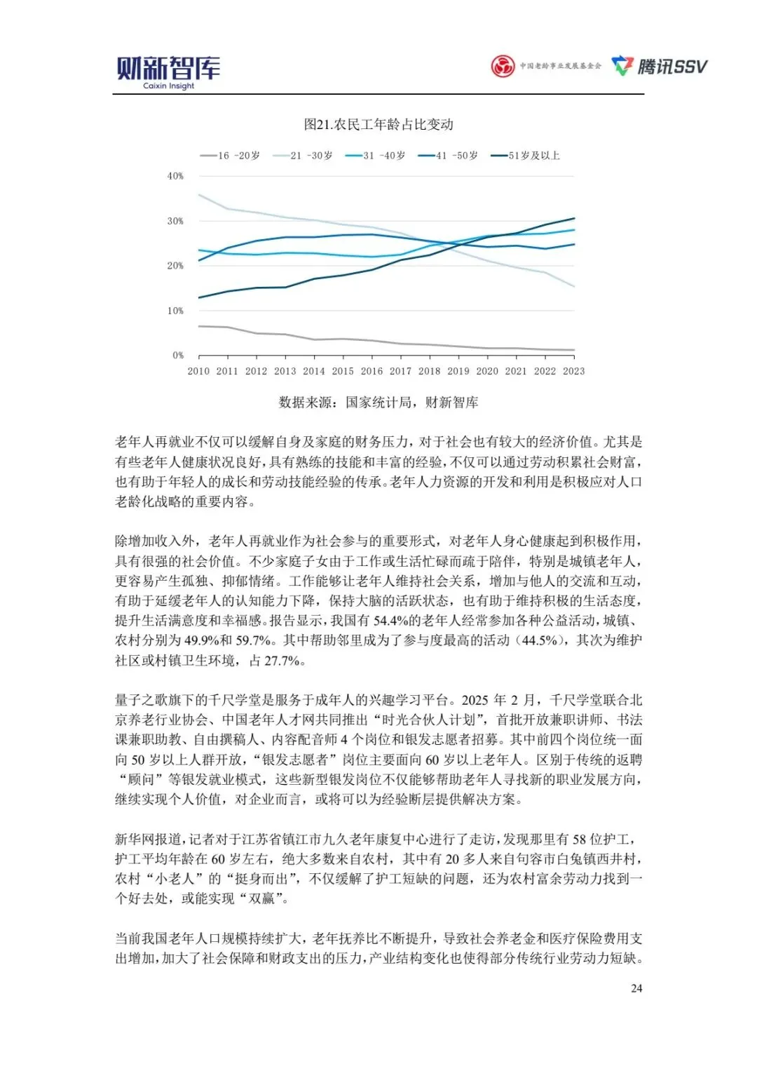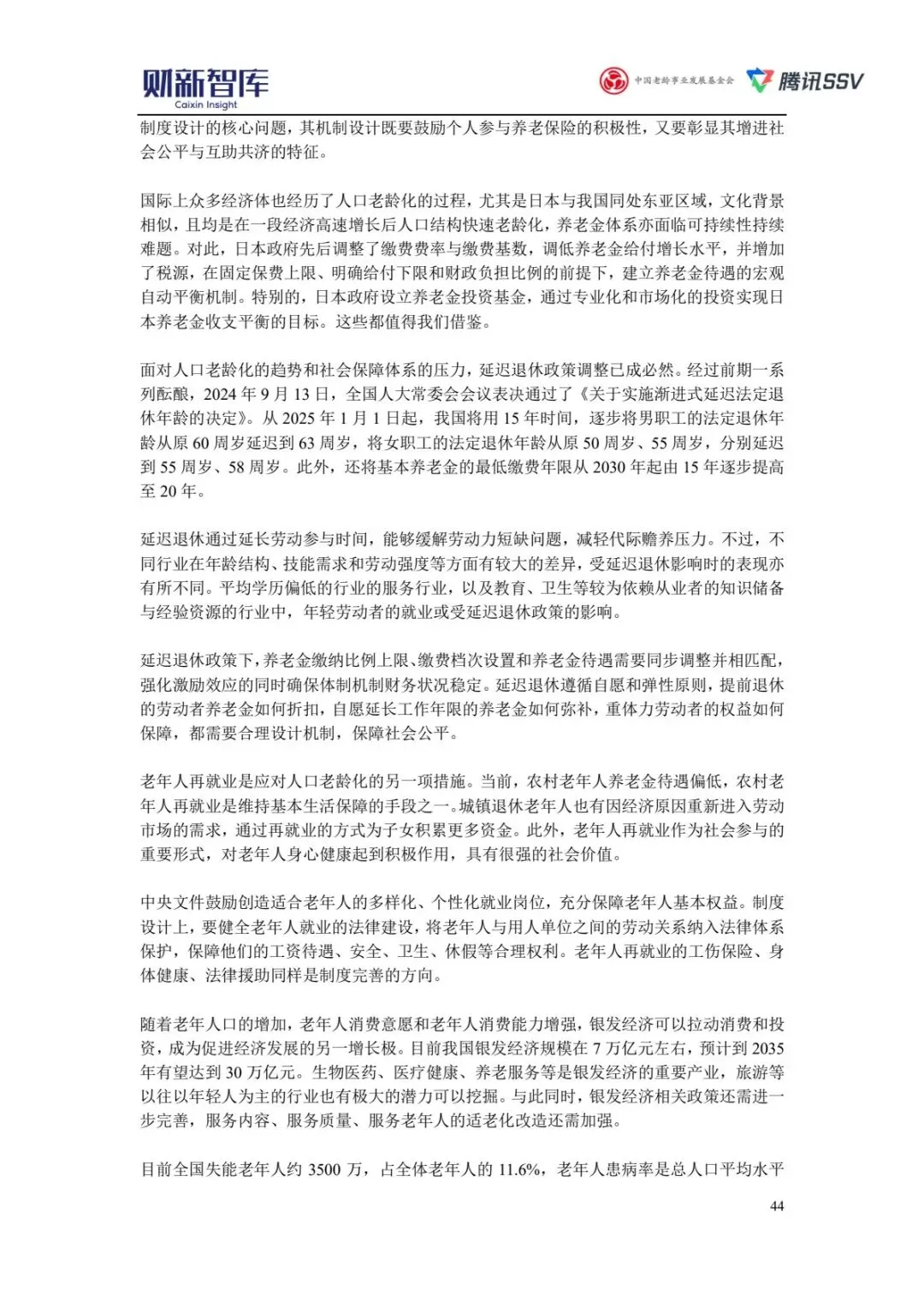 2021年农村老年人年均收入14105元,约为城镇老年人的三成,28.1%的老年人愿意从事有收入的工作。60-64岁老年人就业率34.4%,65-69岁27.5%。 农民工中50岁以上占比已超30%,16-20岁仅1.2%(2010年为6.5%)。76.86%的招聘岗位设有年龄限制。 银发经济规模约7万亿元,预计2035年达30万亿元。2023年老年用品市场5万亿,60岁以上网民1.71亿,网购用户占69.8%。 2023年银发旅游者11.6亿人次,占国内旅游20.6%,2028年市场规模预计2.7万亿。 全国失能老年人约3500万,占老年人11.6%,患病率是总人口4倍,带病生存8年+。城镇长护需求1.4万亿,保障端不到5000亿,缺口超9000亿。失能到身故平均88个月。 养老护理人员潜在需求1000万+,实际仅30多万。43.8%日工作超10小时,年流失率30%+。失能月均护理费4500元+,比自理高出近2000元。 长期护理险试点49城,覆盖1.8亿人,但保障对象多限于城镇职工,重度失能月度标准约2000元,仅覆盖约三成护理费用。 60岁以上老年人网络支付使用率75.4%,用户规模1.17亿。日本GPIF养老金基金管理资产260万亿日元,2001年至今年化收益4.4%,值得借鉴。 养老机器人分三类:护理机器人(辅助生活起居)、康复机器人(相对成熟)、陪伴机器人(情感慰藉)。目前护理机器人仅能作为辅助用具,陪伴机器人信任感和体验感仍待提高。