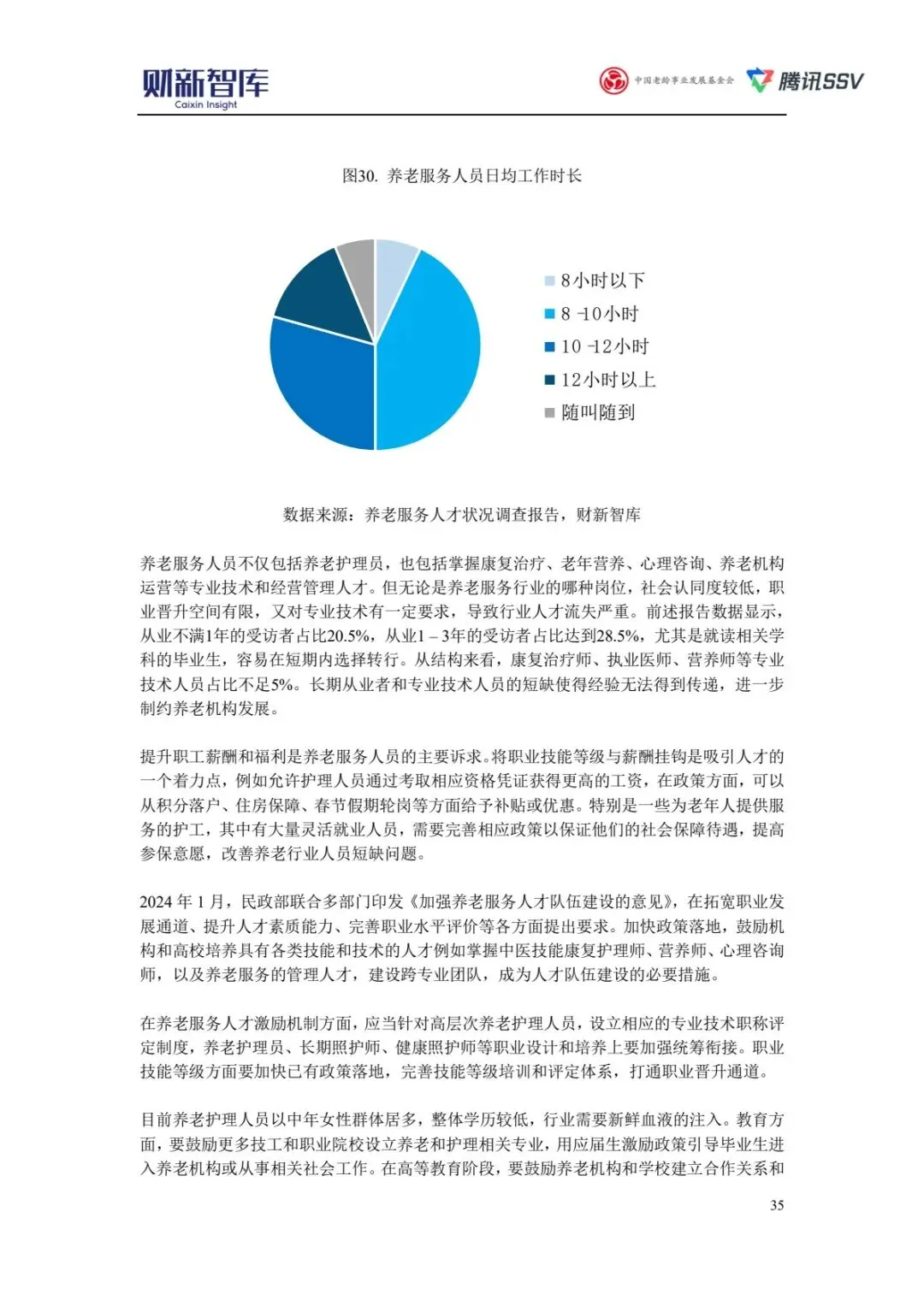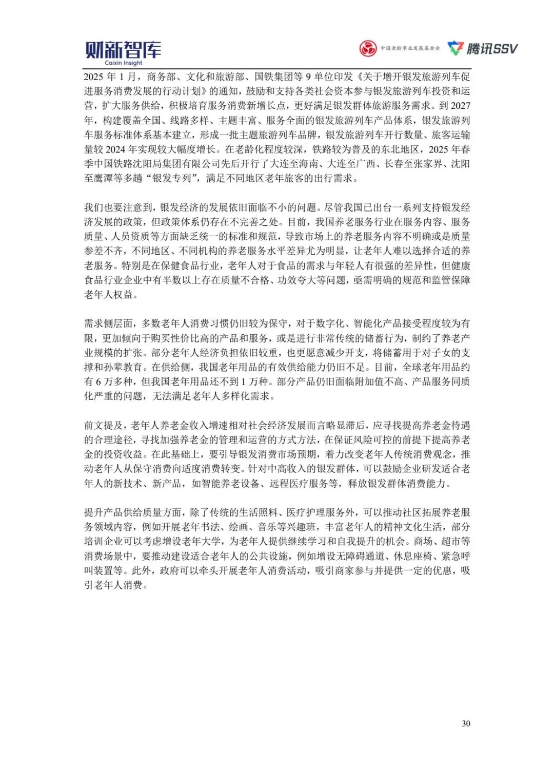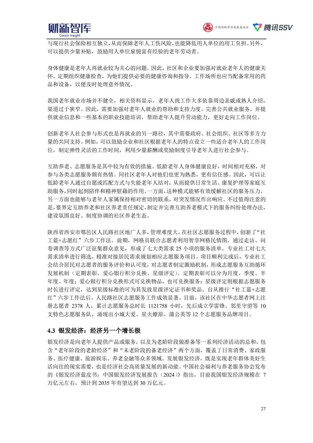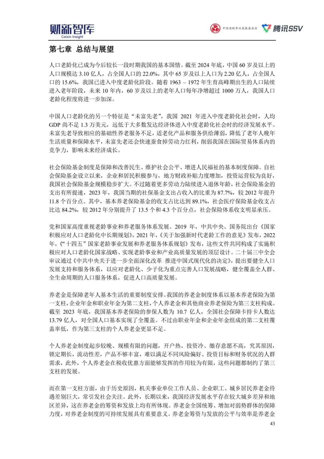 2021年农村老年人年均收入14105元,约为城镇老年人的三成,28.1%的老年人愿意从事有收入的工作。60-64岁老年人就业率34.4%,65-69岁27.5%。 农民工中50岁以上占比已超30%,16-20岁仅1.2%(2010年为6.5%)。76.86%的招聘岗位设有年龄限制。 银发经济规模约7万亿元,预计2035年达30万亿元。2023年老年用品市场5万亿,60岁以上网民1.71亿,网购用户占69.8%。 2023年银发旅游者11.6亿人次,占国内旅游20.6%,2028年市场规模预计2.7万亿。 全国失能老年人约3500万,占老年人11.6%,患病率是总人口4倍,带病生存8年+。城镇长护需求1.4万亿,保障端不到5000亿,缺口超9000亿。失能到身故平均88个月。 养老护理人员潜在需求1000万+,实际仅30多万。43.8%日工作超10小时,年流失率30%+。失能月均护理费4500元+,比自理高出近2000元。 长期护理险试点49城,覆盖1.8亿人,但保障对象多限于城镇职工,重度失能月度标准约2000元,仅覆盖约三成护理费用。 60岁以上老年人网络支付使用率75.4%,用户规模1.17亿。日本GPIF养老金基金管理资产260万亿日元,2001年至今年化收益4.4%,值得借鉴。 养老机器人分三类:护理机器人(辅助生活起居)、康复机器人(相对成熟)、陪伴机器人(情感慰藉)。目前护理机器人仅能作为辅助用具,陪伴机器人信任感和体验感仍待提高。
