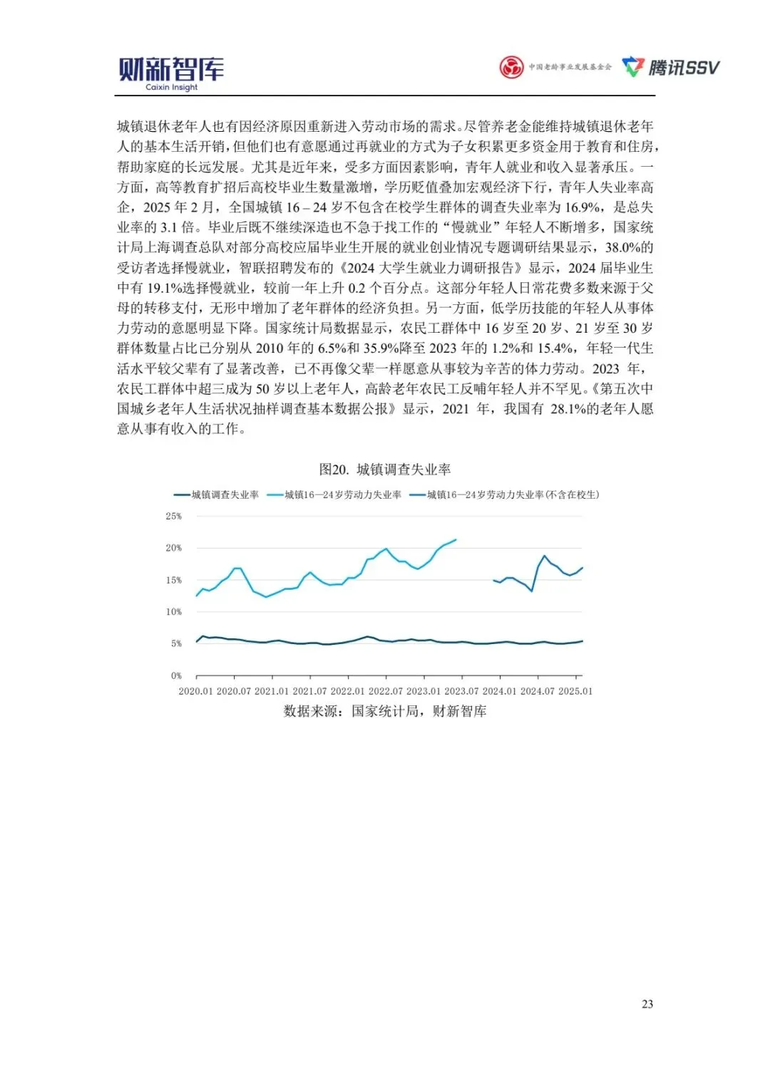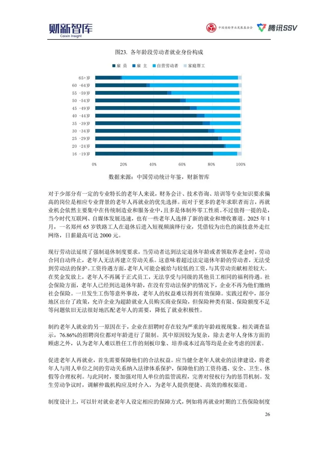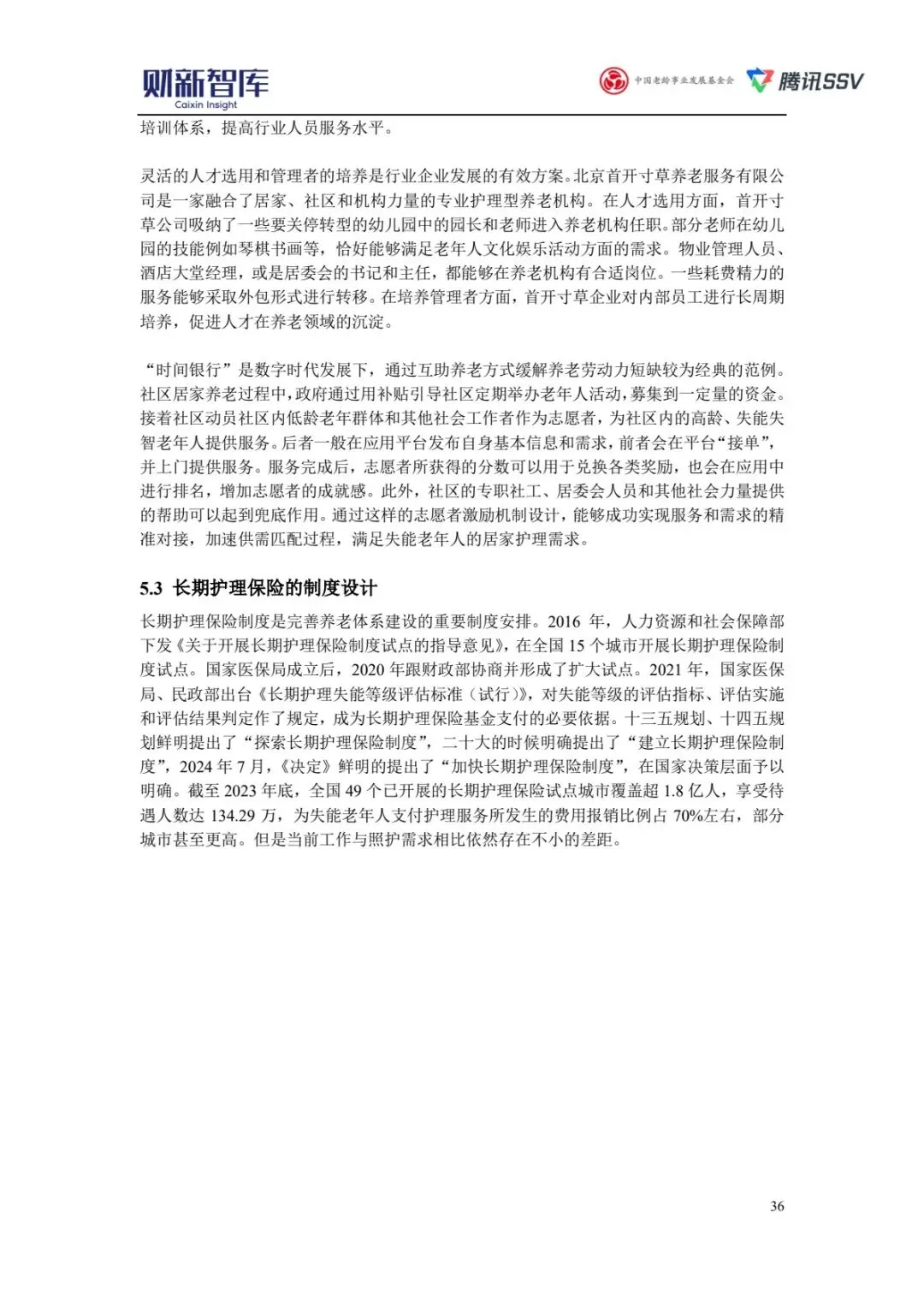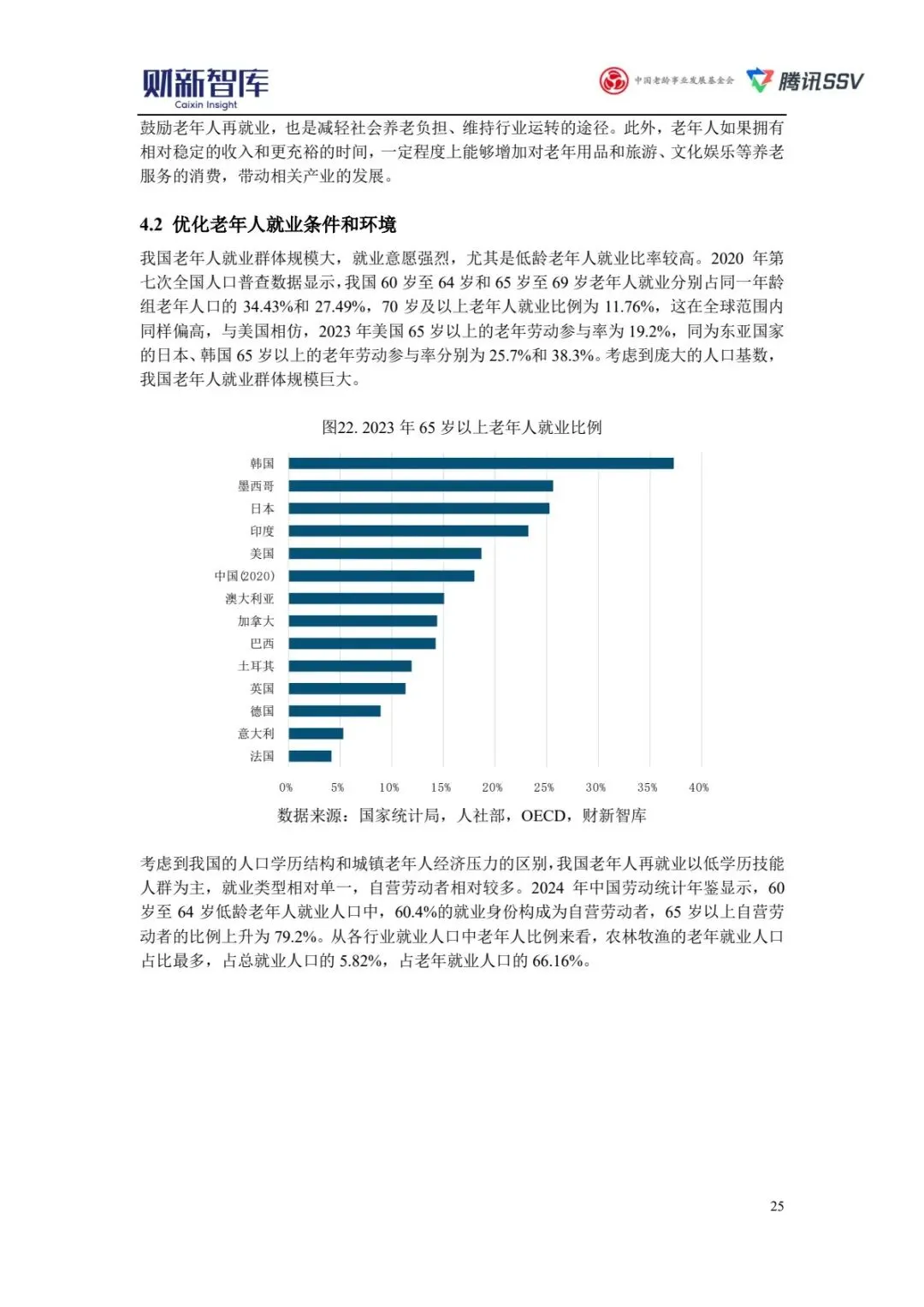 2021年农村老年人年均收入14105元,约为城镇老年人的三成,28.1%的老年人愿意从事有收入的工作。60-64岁老年人就业率34.4%,65-69岁27.5%。 农民工中50岁以上占比已超30%,16-20岁仅1.2%(2010年为6.5%)。76.86%的招聘岗位设有年龄限制。 银发经济规模约7万亿元,预计2035年达30万亿元。2023年老年用品市场5万亿,60岁以上网民1.71亿,网购用户占69.8%。 2023年银发旅游者11.6亿人次,占国内旅游20.6%,2028年市场规模预计2.7万亿。 全国失能老年人约3500万,占老年人11.6%,患病率是总人口4倍,带病生存8年+。城镇长护需求1.4万亿,保障端不到5000亿,缺口超9000亿。失能到身故平均88个月。 养老护理人员潜在需求1000万+,实际仅30多万。43.8%日工作超10小时,年流失率30%+。失能月均护理费4500元+,比自理高出近2000元。 长期护理险试点49城,覆盖1.8亿人,但保障对象多限于城镇职工,重度失能月度标准约2000元,仅覆盖约三成护理费用。 60岁以上老年人网络支付使用率75.4%,用户规模1.17亿。日本GPIF养老金基金管理资产260万亿日元,2001年至今年化收益4.4%,值得借鉴。 养老机器人分三类:护理机器人(辅助生活起居)、康复机器人(相对成熟)、陪伴机器人(情感慰藉)。目前护理机器人仅能作为辅助用具,陪伴机器人信任感和体验感仍待提高。