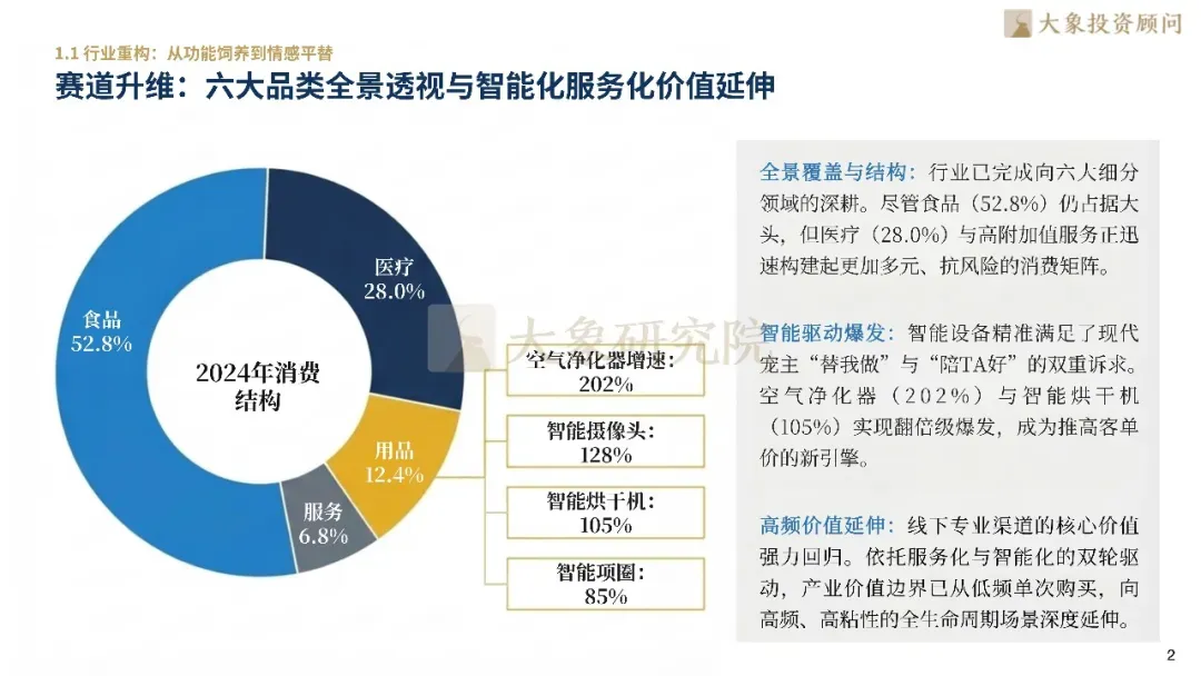 养宠观念已由早期的“附属品”转变为“情感刚需”。随着城市化加速,超85%的年轻宠主将宠物视为家庭成员,这种“拟人化”趋势驱动产业逻辑由“生存”转向“生活”,产业链定义被重新书写,跨越至涵盖全生命周期的消费矩阵。情感投射赋予了宠物行业极强的抗风险能力,即便在宏观经济波动中,刚需支出占比仍持续提升,展现出显著的抗周期韧性。同时,行业正经历赛道升维,医疗与智能化设备迅速爆发,将价值边界向高频、高粘性的全生命周期场景深度延伸。