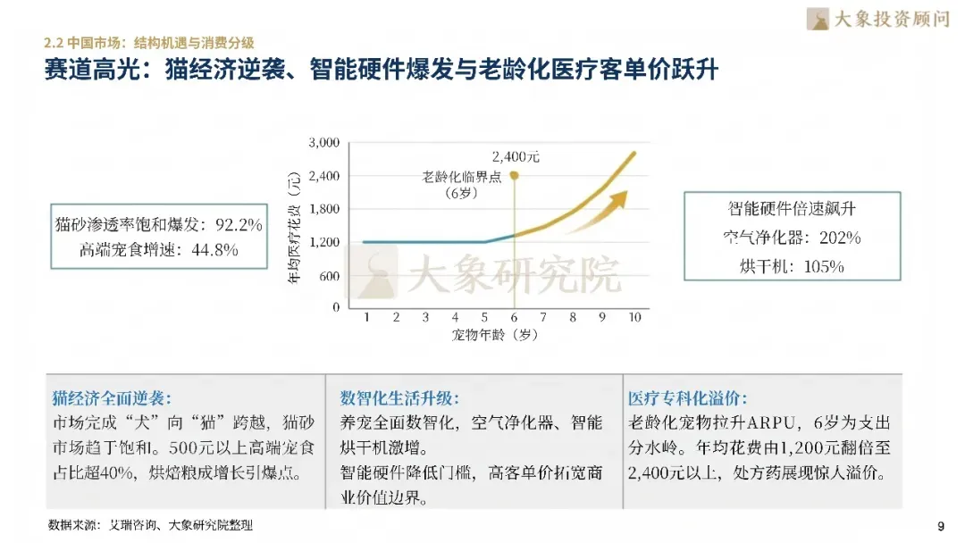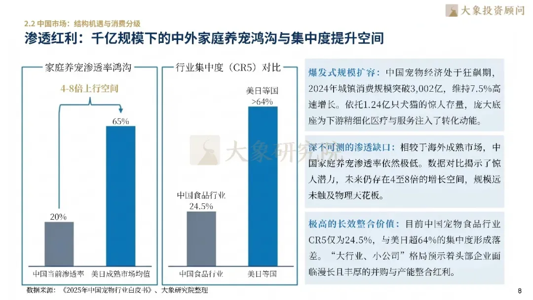 全球宠物市场规模已突破3,000亿美元,北美与欧洲构筑了稳固存量基盘,东南亚则以24.7%的年复合增长率成为高增高地。中国市场2024年消费规模突破3,002亿元,增速达7.5%。目前中国养宠渗透率仅约20%,远低于美日等成熟市场(>65%),预示未来有4-8倍增长空间。此外,中国呈现“大行业、小公司”格局,食品CR5仅24.5%,头部企业面临丰厚整合红利。消费结构上,猫经济全面逆袭,高端宠食占比超40%,且老龄化宠物的医疗花费呈现翻倍增长态势。