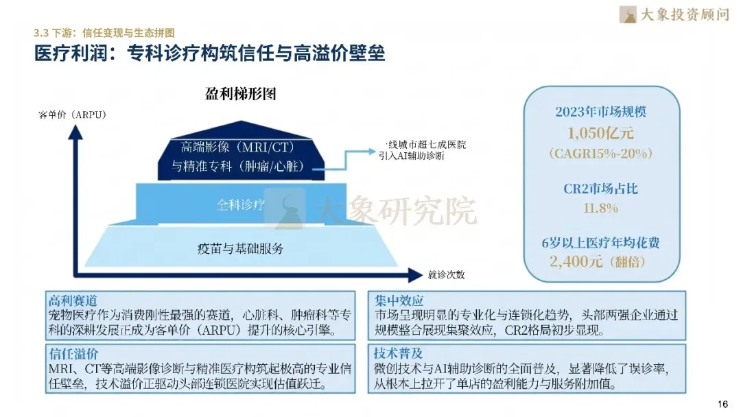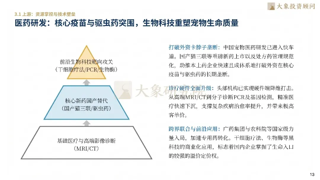 在上游,国产猫三联、驱虫药等新药正打破外资垄断,精准医疗普及支撑了高技术溢价。中游宠食进入“机能化”时代,低温烘焙工艺对传统高温膨化形成代际降维打击。头部品牌通过“五0添加”重塑信任,并利用一物一码实现全链溯源。行业正利用AIoT技术构建数字化养宠闭环,将智能设备与云端医疗融合,贴合精细化管理需求。下游医疗端,心脏、肿瘤等专科深耕成为ARPU提升的核心引擎,头部连锁医院通过高端影像诊断构筑专业信任壁垒,实现了从“低价平替”向“技术领先”的逻辑扭转。
