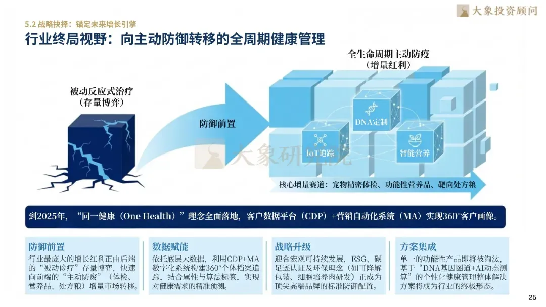 触达逻辑重构,兴趣电商成为第一增长动能,线下门店转型为情感社交中心,构建OMO决策闭环。营销转向以专业科普构建信任,利用数字化工具实现用户资产沉淀。行业增长红利正从后端的“被动诊疗”存量博弈,向前端的“主动防御”(体检、处方粮)增量市场转移。未来,基于“DNA基因图谱+AI动态测算”的个性化管理将成为终极形态。此外,迎合可持续发展,ESG、碳足迹认证正成为顶尖品牌标配。科技与人文的深度交汇,将全面激活产业价值跃迁动能,驱动行业向整体生命质量管理迈进。