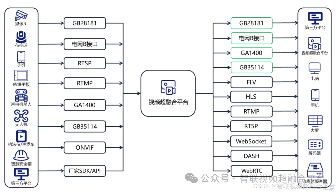 智联视频超融合平台通过GB/T28181-2011/2016/2022、国网B接口、RTSP、RTMP、ONVIF、GB/T35114、GA1400、海康大华SDK/API等方式,接入海康、大华、宇视等各个厂家的摄像机、录像机,接入直播手机,接入下级平台,提供web客户端进行视频预览、录像回放、配置管理和智慧运维。