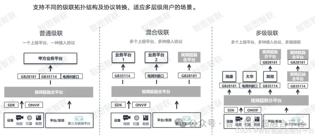 支持按照GB/T28181-2011/2016/2022、国网B接口、GB/T35114、GA1400等协议对接到上级平台,包括智联视频云平台和第三方平台。支持普通级联,多级级联,混合级联等多种级联方式。