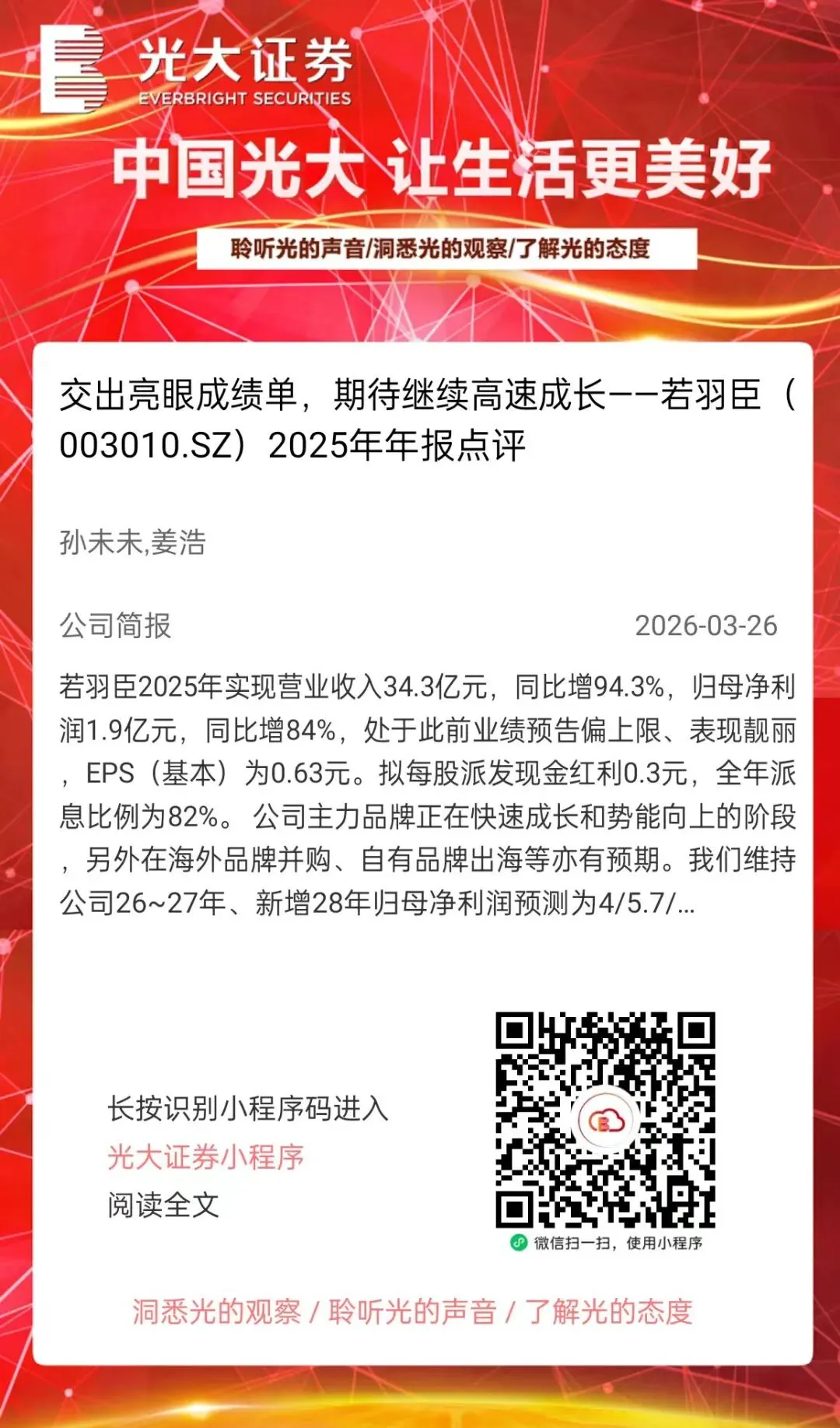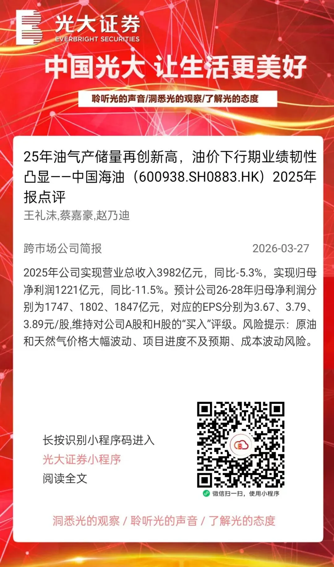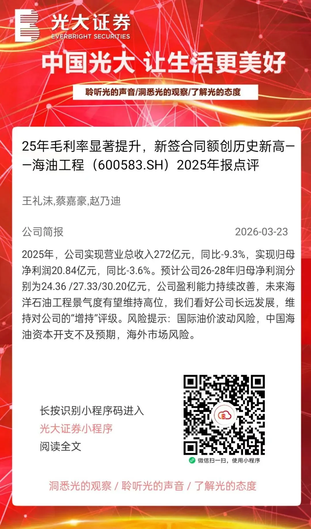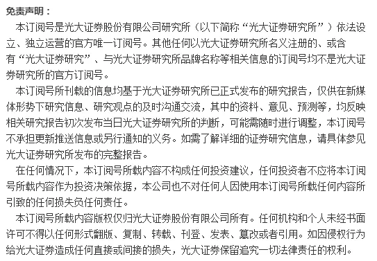 本订阅号中所涉及的证券研究信息由光大证券研究所编写,仅面向光大证券专业投资者客户,用作新媒体形势下研究信息和研究观点的沟通交流。非光大证券专业投资者客户,请勿订阅、接收或使用本订阅号中的任何信息。本订阅号难以设置访问权限,若给您造成不便,敬请谅解。光大证券研究所不会因关注、收到或阅读本订阅号推送内容而视相关人员为光大证券的客户。