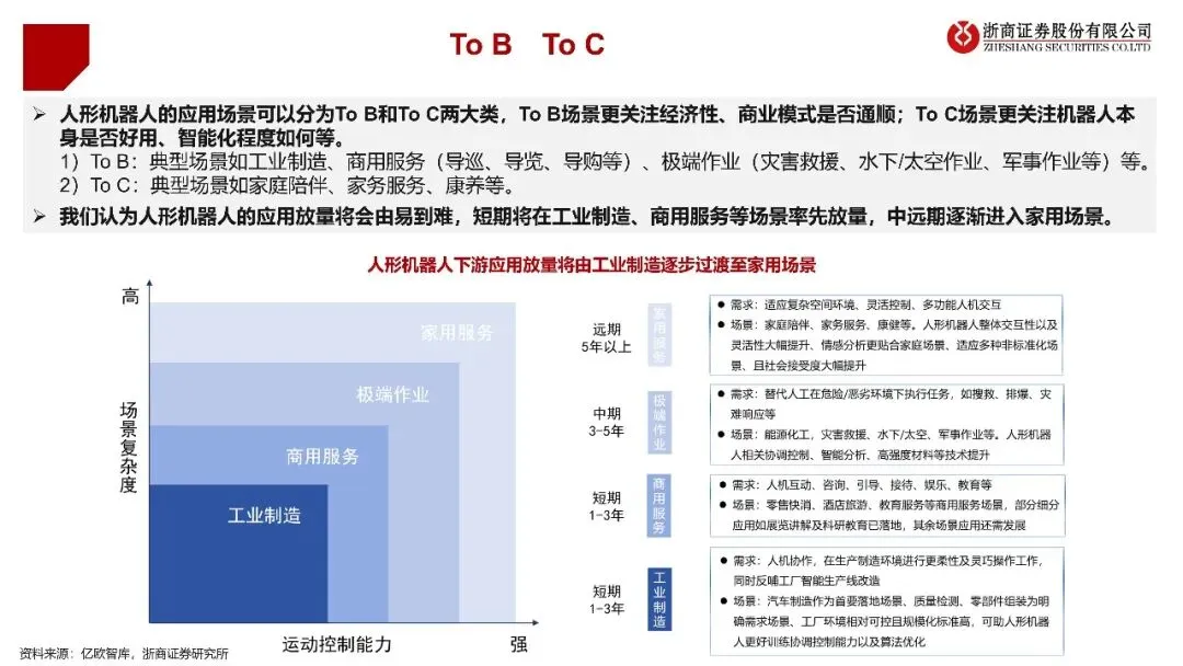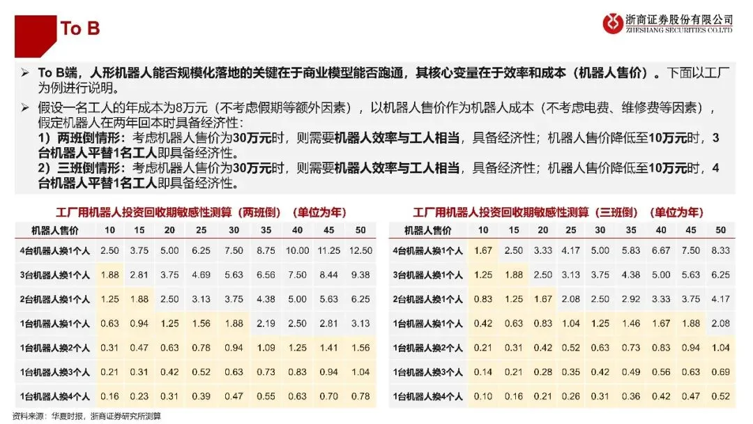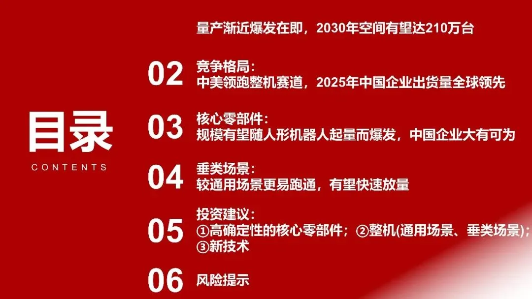 报告针对市场空间开展了量化测算,表明商业化路径会从易至难、按部就班。在短期(1-3年)内,人形机器人会首先在工业制造、仓储物流等ToB场景实现落地,其商业模型能否成功运行,取决于“机器人成本”与“人工效率”之间的经济性平衡状况。报告借助敏感性测算,呈现出当机器人售价降低到10 - 15万元时,其投资回收期将会极具吸引力。在中长期这一阶段(时长为5至10年),由于泛化能力得到提升,机器人会慢慢进入家庭,去承担陪伴、家务等属于ToC场景的工作。预估到2030年的时候,仅仅是中国和美国这两个国家的制造业以及家政业,对于人形机器人的需求将会达到大约210万台,与之对应的市场规模大概是3146亿元人民币。